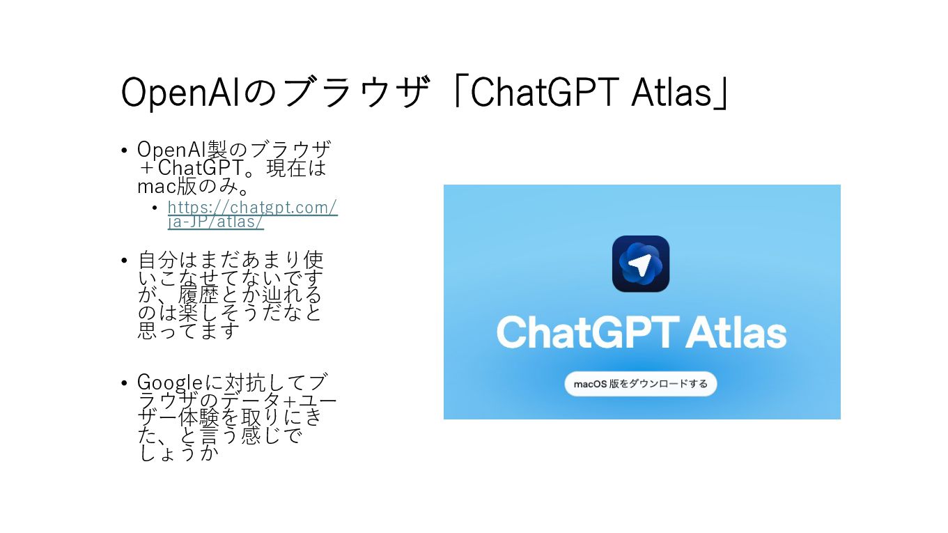 OpenAIのブラウザ「ChatGPT Atlas」 • OpenAI製のブラウザ +ChatGPT。現在は mac版のみ。 • https://chatgpt.com/ ja-JP/atlas/ •
