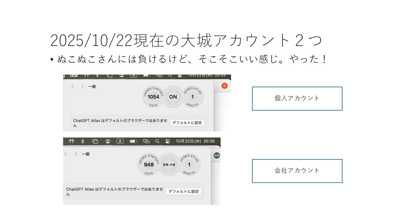 2025/10/22現在の⼤城アカウント2つ • ぬこぬこさんには負けるけど、そこそこいい感じ。やった! 個⼈アカウント 会社アカウント