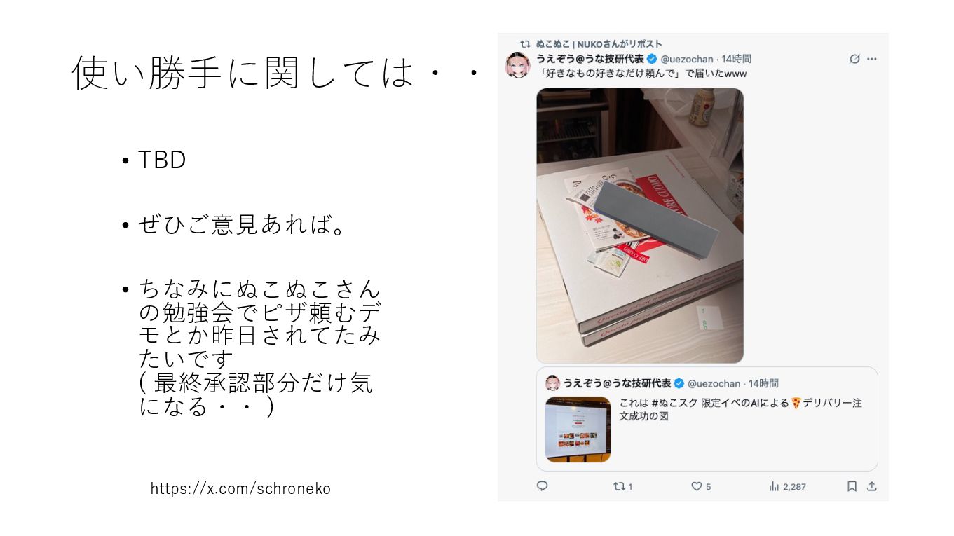 使い勝⼿に関しては・・ • TBD • ぜひご意⾒あれば。 • ちなみにぬこぬこさん の勉強会でピザ頼むデ モとか昨⽇されてたみ たいです