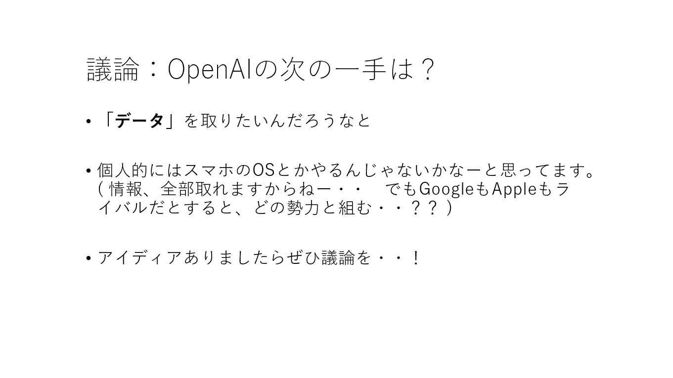 議論:OpenAIの次の⼀⼿は? • 「データ」を取りたいんだろうなと • 個⼈的にはスマホのOSとかやるんじゃないかなーと思ってます。 ( 情報、全部取れますからねー・・ でもGoogleもAppleもラ イバルだとすると、どの勢⼒と組む・・?? )