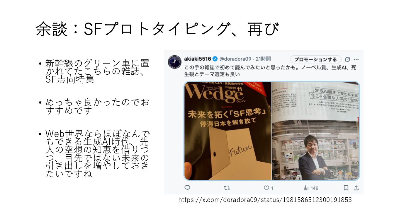 余談:SFプロトタイピング、再び • 新幹線のグリーン⾞に置 かれてたこちらの雑誌、 SF志向特集 • めっちゃ良かったのでお すすめです • Web世界ならほぼなんで