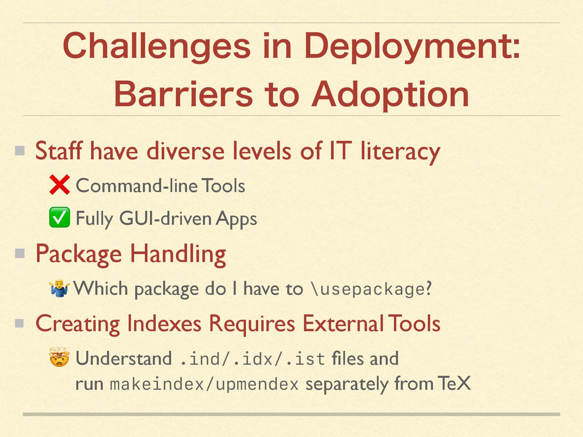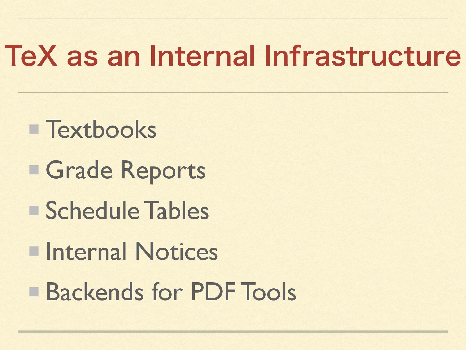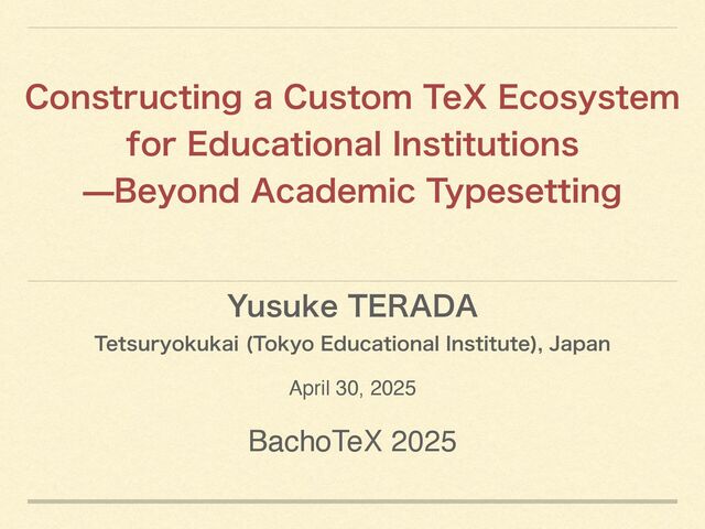 It introduces the design and implementation of a custom TeX ecosystem developed over 18 years at a Japanese educational institution.
