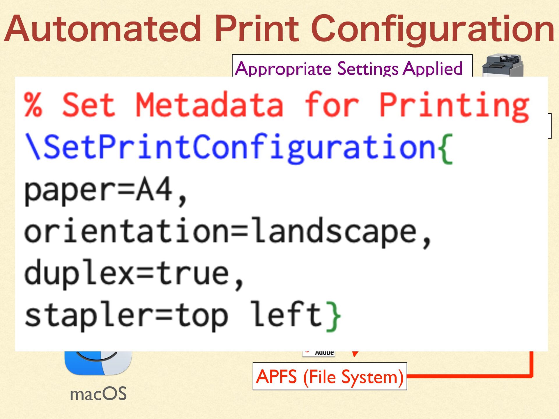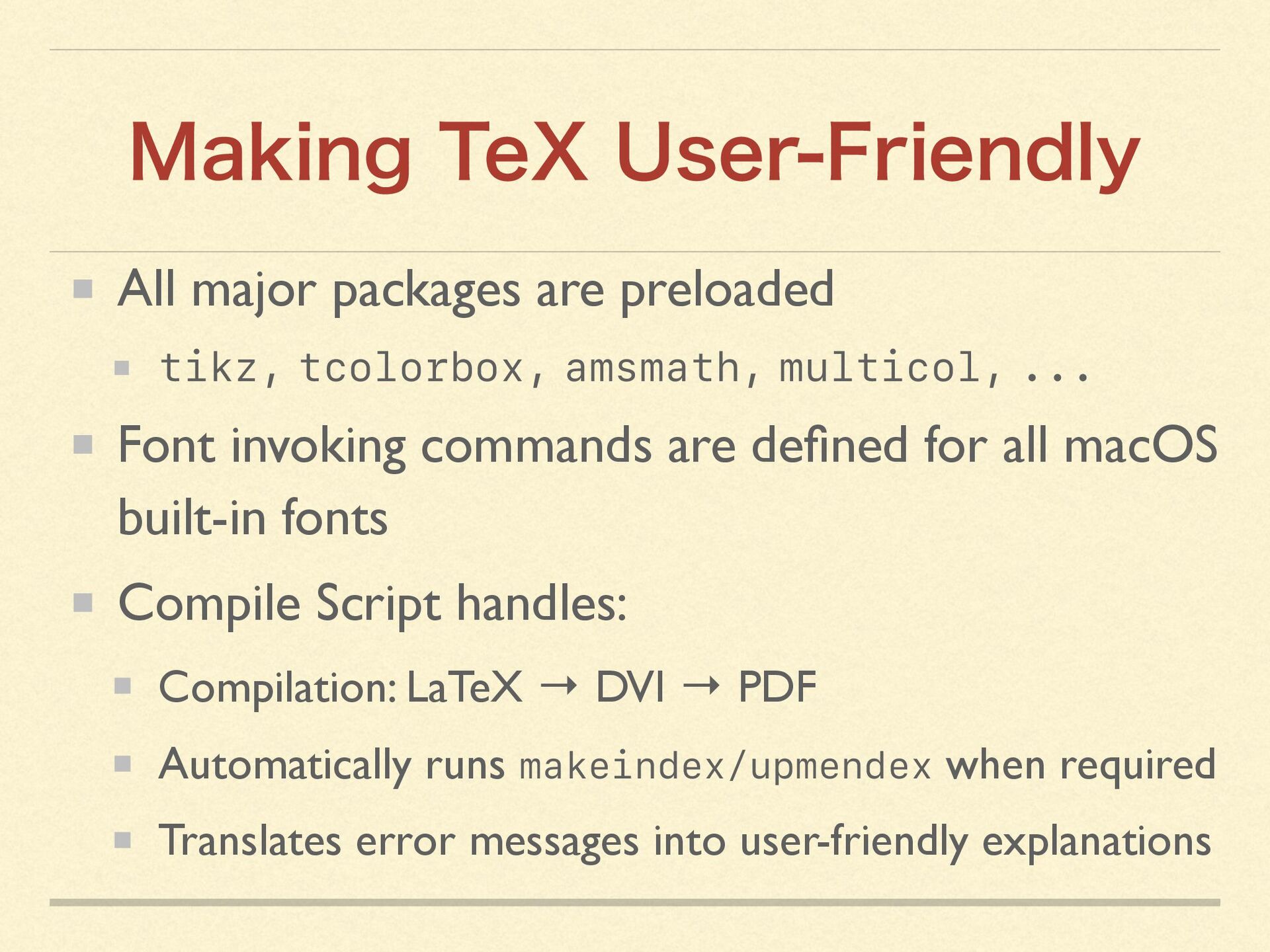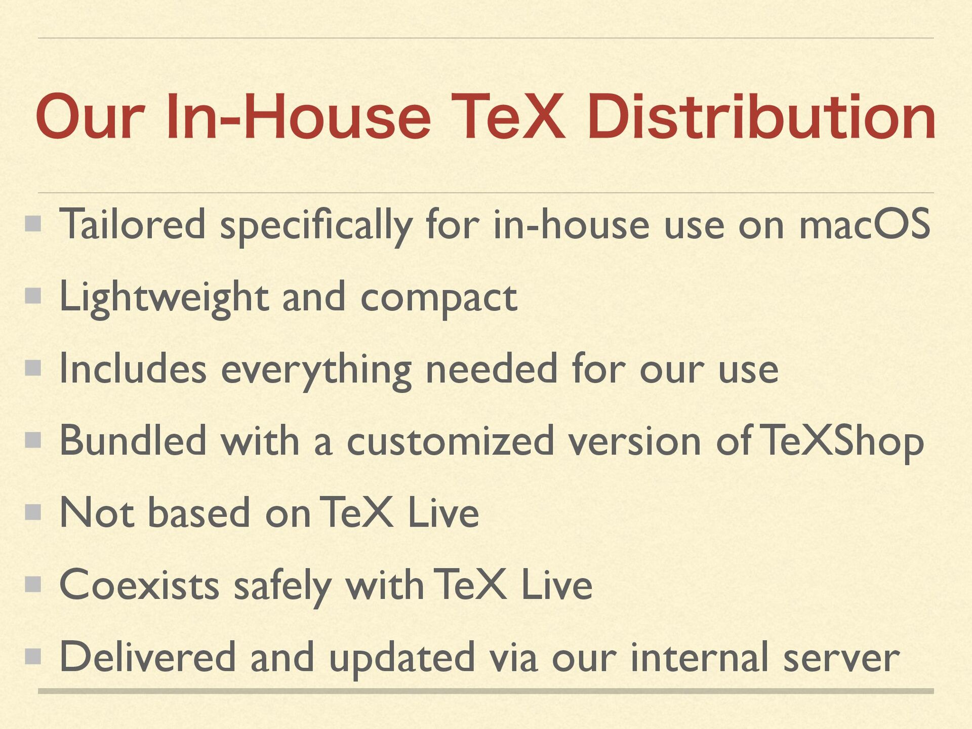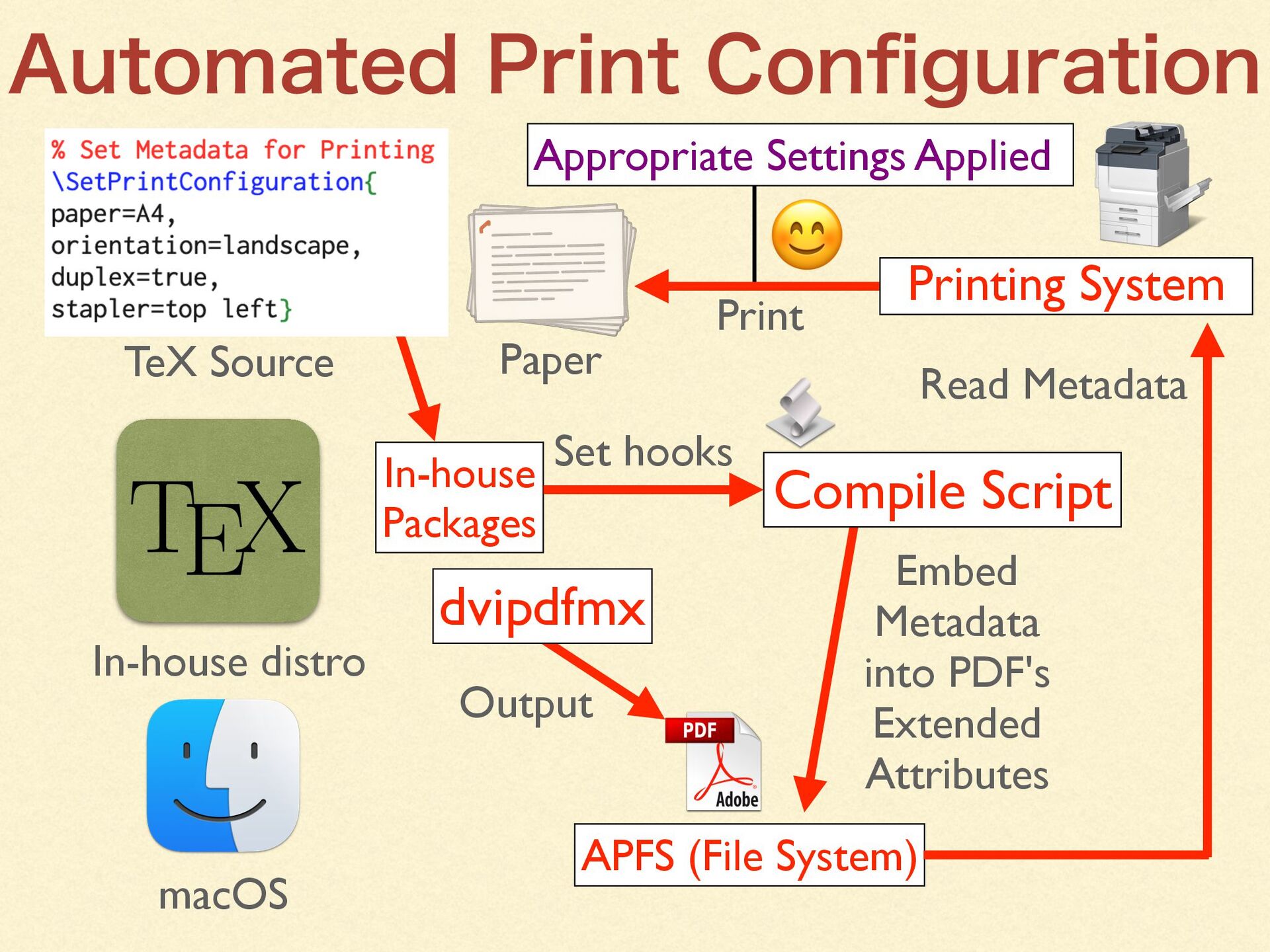 By creating an in-house TeX distribution tightly integrated with macOS, we were able to leverage macOS capabilities to the fullest—enabling even non-technical staff to produce professional-quality documents with a single click.