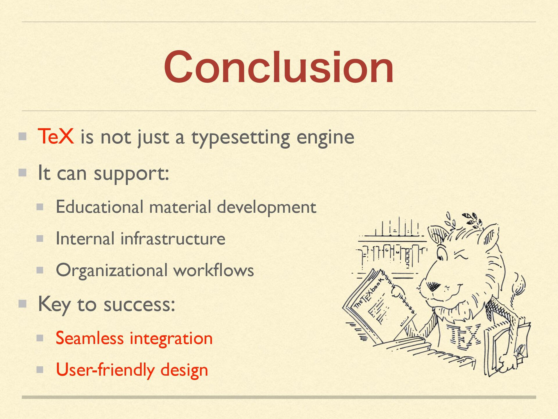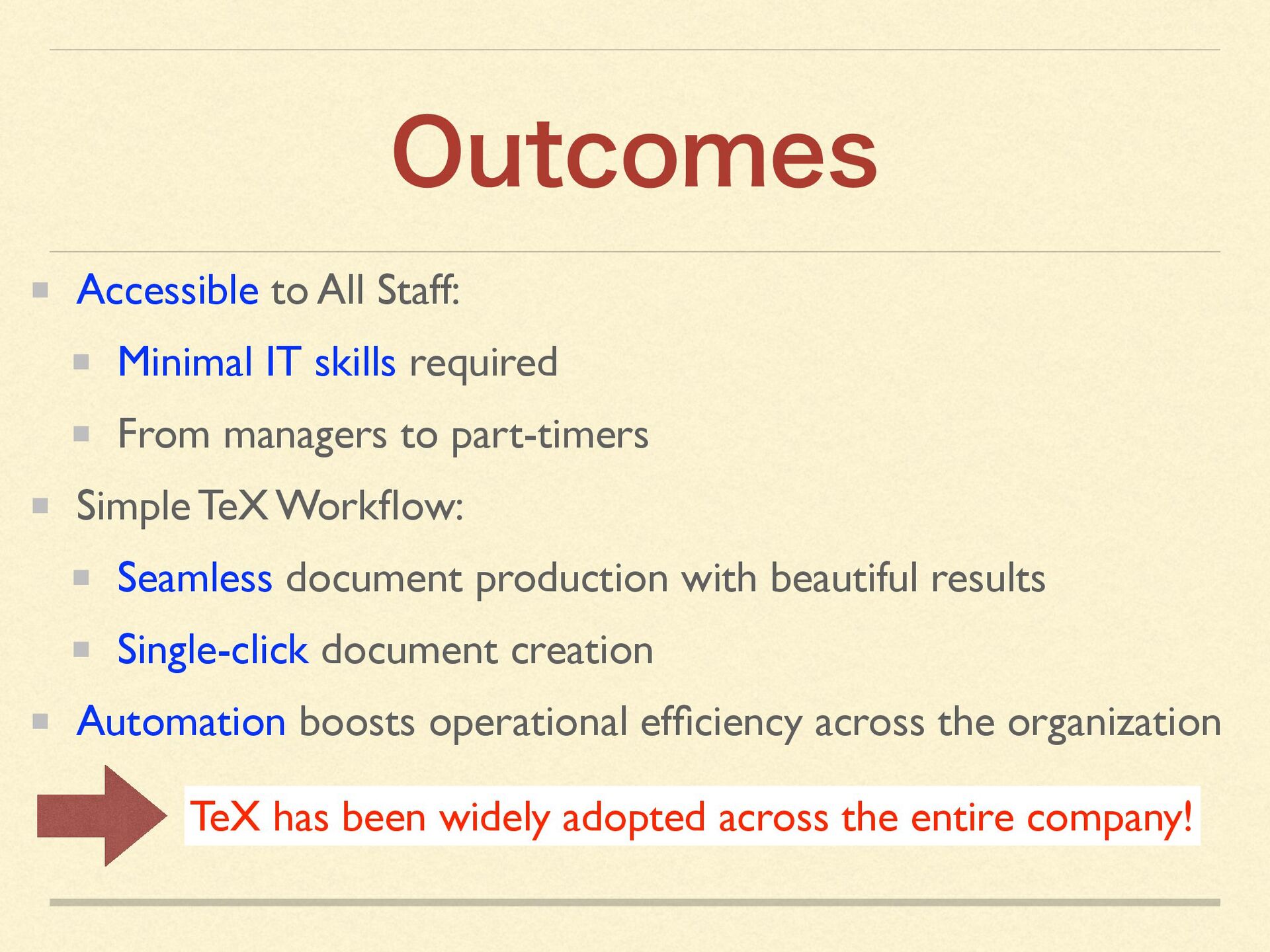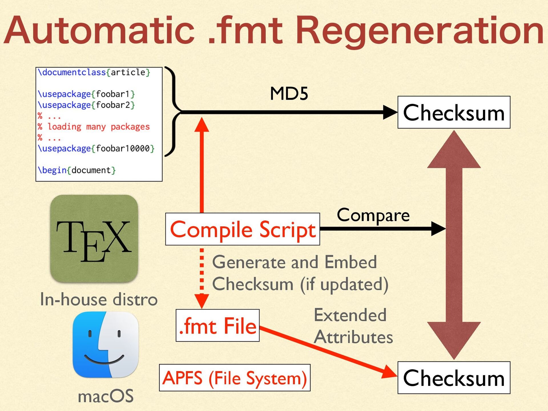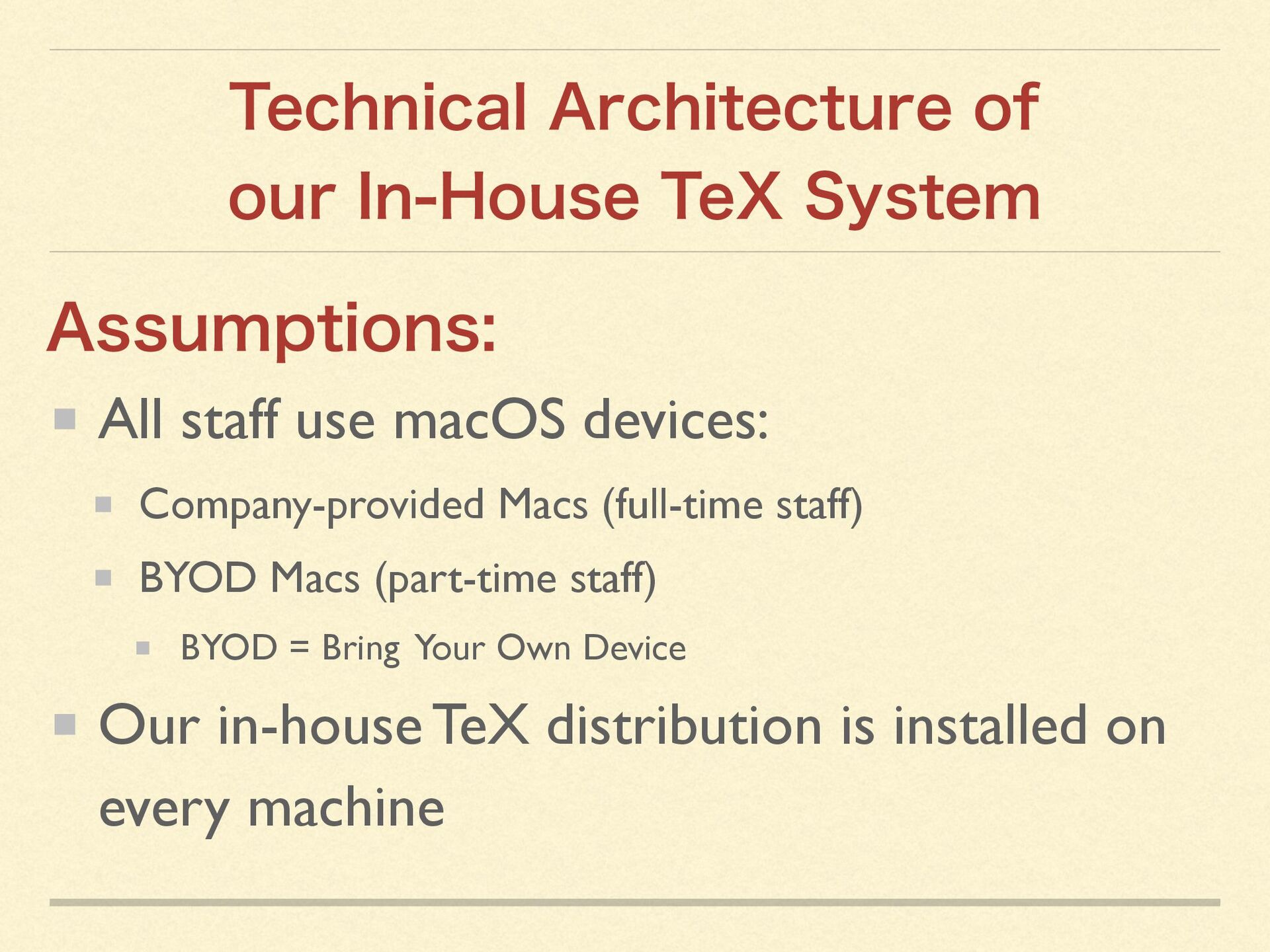 By creating an in-house TeX distribution tightly integrated with macOS, we were able to leverage macOS capabilities to the fullest—enabling even non-technical staff to produce professional-quality documents with a single click.