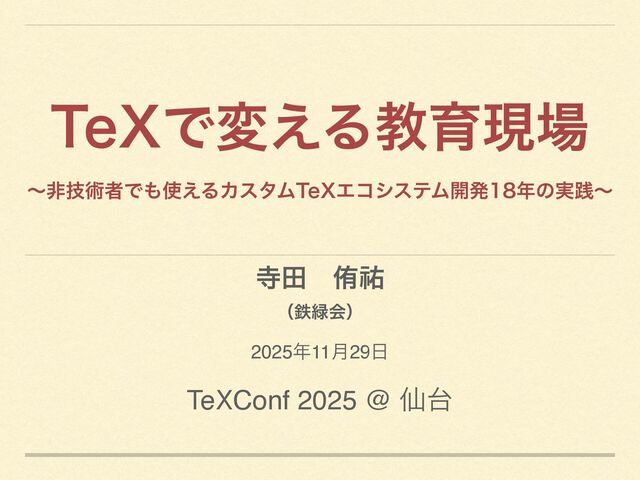 TeX Conf 2025 での講演「TeXで変える教育現場 〜非技術者でも使えるカスタムTeXエコシステム開発18年の実践〜」の発表資料です。