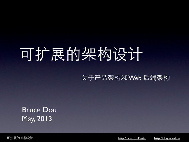 Nginx(Layer 7) 虚拟化: LXC、KVM、Xen HA:Keepalived、Heartbeat 分布式缓存: Memcache, Redis 消息队列: 0MQ, Beanstalkd、Gearman、etc 监控和⾃自恢复⼯工具: Supervised, Monit, Forever, etc Storage RDMS:MySQL、Postgres Storage K-V DB: MySQL(handlersocket)、Redis、Hbase、LevelDB、 Riak、S3 Internal DNS:dnsmasq 集中 Logging、图表:Logstash、Graphite 压测⼯工具:Tcpcopy、EM-Proxy、Seige、Tsung 可扩展的架构设计 http://blog.eood.cn http://t.cn/zHxOsAx