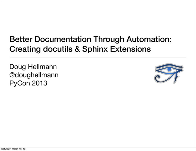 Sphinx is an incredibly useful tool for creating attractive documentation for your project, but if all you ever use it for is converting reStructuredText files to HTML you are barely scratching the surface of its power. This presentation shows how easy it is to extend Sphinx by defining new markup processors, allowing you to take your documentation to the next level.
