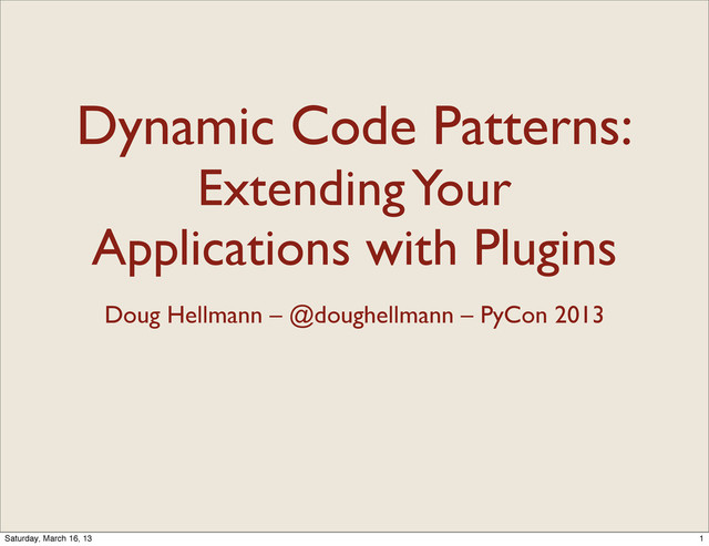 Python makes loading code dynamically easy, allowing you to configure and extend your application by discovering and loading extensions at runtime. This presentation will discuss the techniques for dynamic code loading used in several well-known applications and weigh the pros and cons of each approach.