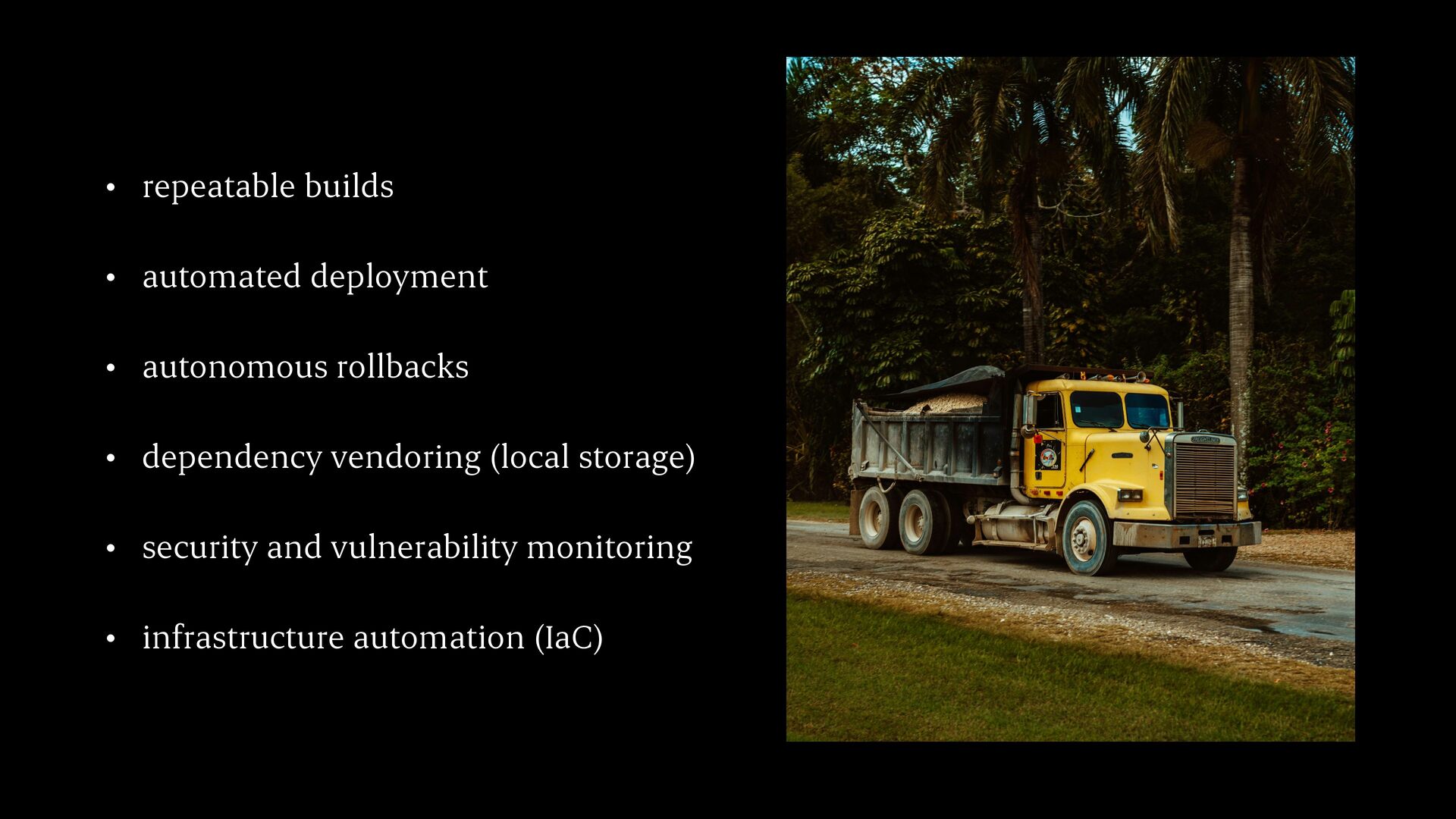 dependency vendoring (local storage) • security and vulnerability monitoring • infrastructure automation (IaC)