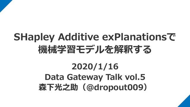 approach to interpreting model predictions." Advances in Neural Information Processing Systems. 2017. • Lundberg, Scott M., Gabriel G. Erion, and Su-In Lee. "Consistent individualized feature attribution for tree ensembles." arXiv preprint arXiv:1802.03888 (2018). • Lundberg, Scott M., et al. "Explainable AI for Trees: From Local Explanations to Global Understanding." arXiv preprint arXiv:1905.04610 (2019). • Sundararajan, Mukund, and Amir Najmi. "The many Shapley values for model explanation." arXiv preprint arXiv:1908.08474 (2019). • Janzing, Dominik, Lenon Minorics, and Patrick Blöbaum. "Feature relevance quantification in explainable AI: A causality problem." arXiv preprint arXiv:1910.13413 (2019). • GitHub - slundberg/shap: A game theoretic approach to explain the output of any machine learning model. https://github.com/slundberg/shap. • Molnar, Christoph. "Interpretable machine learning. A Guide for Making Black Box Models Explainable.” (2019). https://christophm.github.io/interpretable-ml-book/. • Biecek, Przemyslaw, and Tomasz Burzykowski. "Predictive Models: Explore, Explain, and Debug." (2019). https://pbiecek.github.io/PM_VEE/. • SHAP(SHapley Additive exPlanations)で機械学習モデルを解釈する https://dropout009.hatenablog.com/entry/2019/11/20/091450. • 岡⽥ 卓. "ゲーム理論 新版. " 有斐閣. (2011).