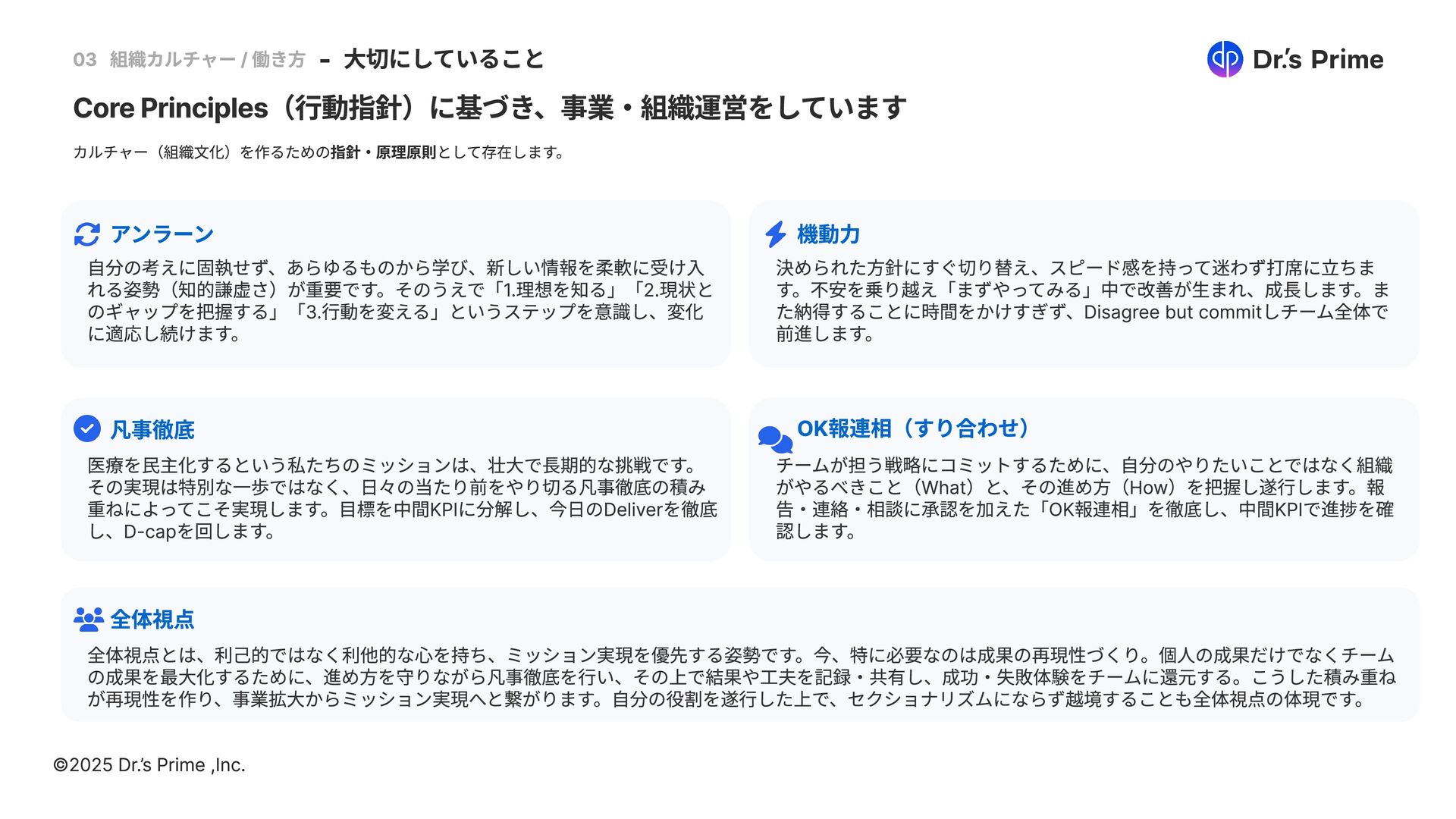 (万円) 1,800 1,600 1,400 1,200 1,000 800 600 400 200 等級別の給与レンジ G1 G2 G3 G4 G5 G6 G7 330 330 400 500 700 1,000 1,500 360 450 600 800 1,100 1,500 等級 各等級要件 G8 企業成長の核となる価値を生み出し、社会的インパクトを与えられる人 G7 経営に責任を持ち、中長期の経営戦略を描いて会社をリードできる人 G6 専門領域の変革を提案し、事業・組織・会社運営における新たな価値創出をリー ドできる人 G5 周囲の模範となり、担当領域の戦略を描き、組織・個人の成長を支援しながら、 実行をリードできる人 G4 難易度の高い仕事や目標であっても、周りを巻き込んで達成できる人 G3 方針を理解して、自律的に仕事を完遂できる人 G2 上長の指示・サポートの下、任されたことを最後までやり切れる人 G1 学習意欲が高く、未経験のことにも前向きにチャレンジできる人