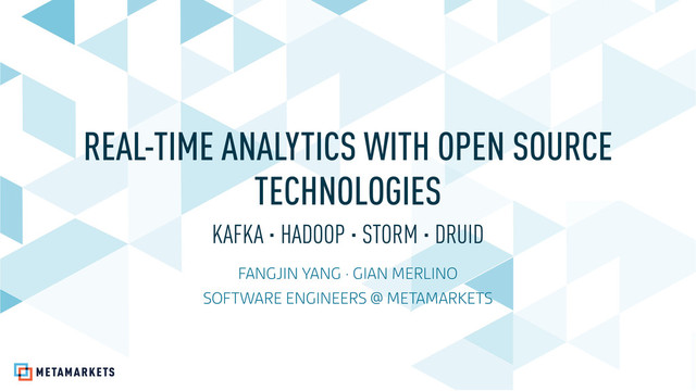 ‣ Kafka provides fast, reliable event transport ‣ Storm and Hadoop clean and prepare data for Druid ‣ Druid handles queries and manages the serving layer ‣ “Real-time Analytics Data Stack” ‣ …a.k.a. RAD Stack ‣ https://metamarkets.com/2014/building-a-data-pipeline/