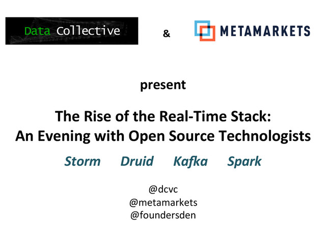 Data Collective and Metamarkets hosted leading technologists in the open source world for drinks, food and conversation about the rise of real-time processing systems, the current limitations of the data engineering space, the value of open source solutions, and where real-time technology is headed.