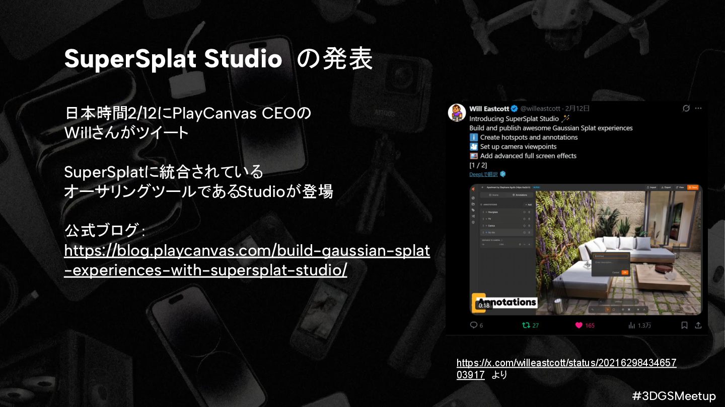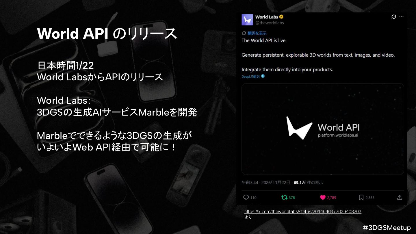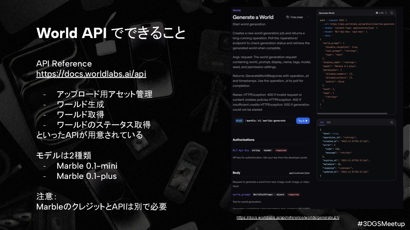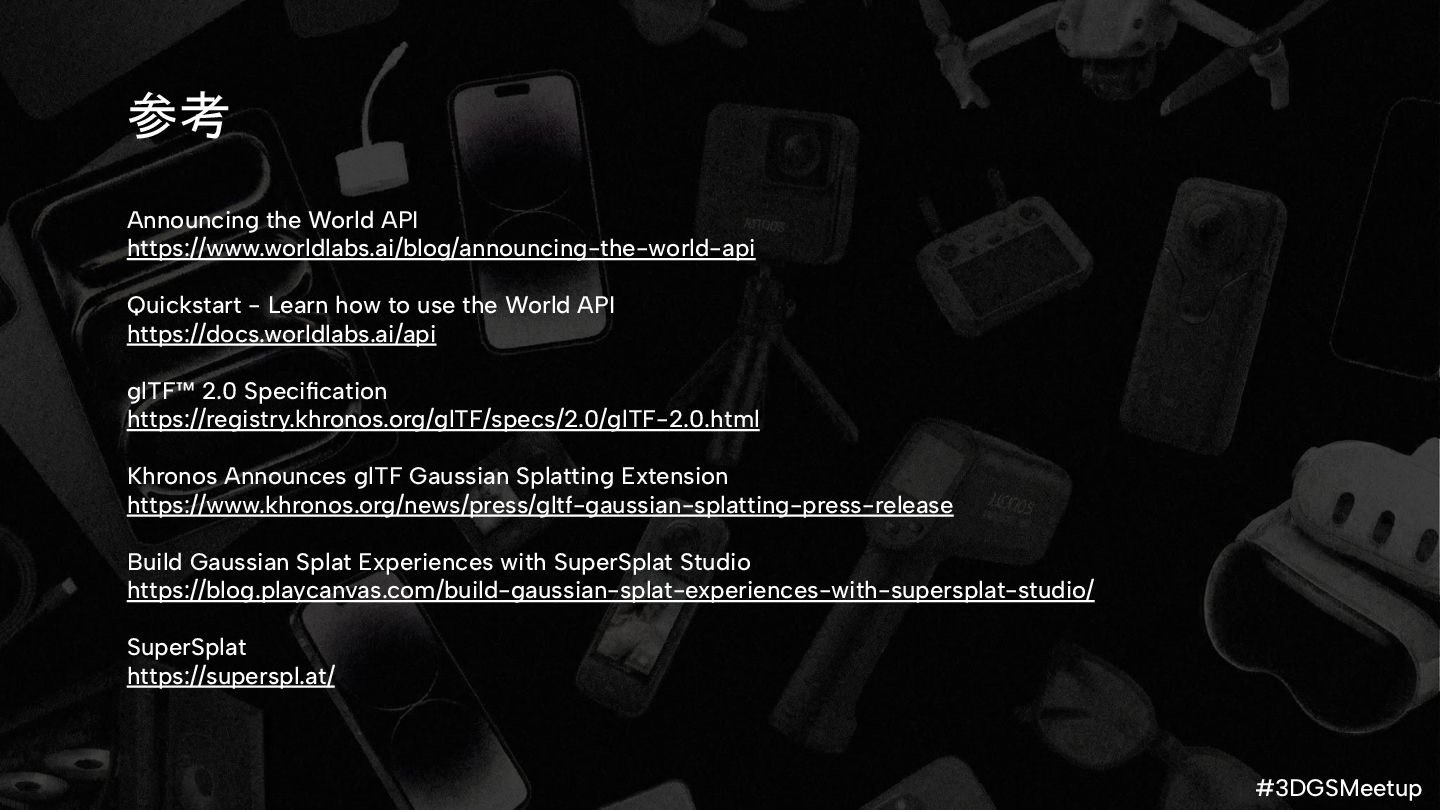 how to use the World API https://docs.worldlabs.ai/api glTF™ 2.0 Specification https://registry.khronos.org/glTF/specs/2.0/glTF-2.0.html Khronos Announces glTF Gaussian Splatting Extension https://www.khronos.org/news/press/gltf-gaussian-splatting-press-release Build Gaussian Splat Experiences with SuperSplat Studio https://blog.playcanvas.com/build-gaussian-splat-experiences-with-supersplat-studio/ SuperSplat https://superspl.at/
