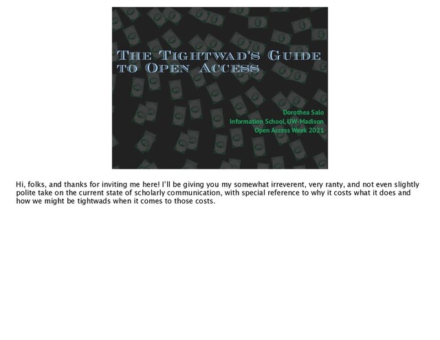 School, UW-Madison Open Access Week 2021 Hi, folks, and thanks for inviting me here! I’ll be giving you my somewhat irreverent, very ranty, and not even slightly polite take on the current state of scholarly communication, with special reference to why it costs what it does and how we might be tightwads when it comes to those costs.