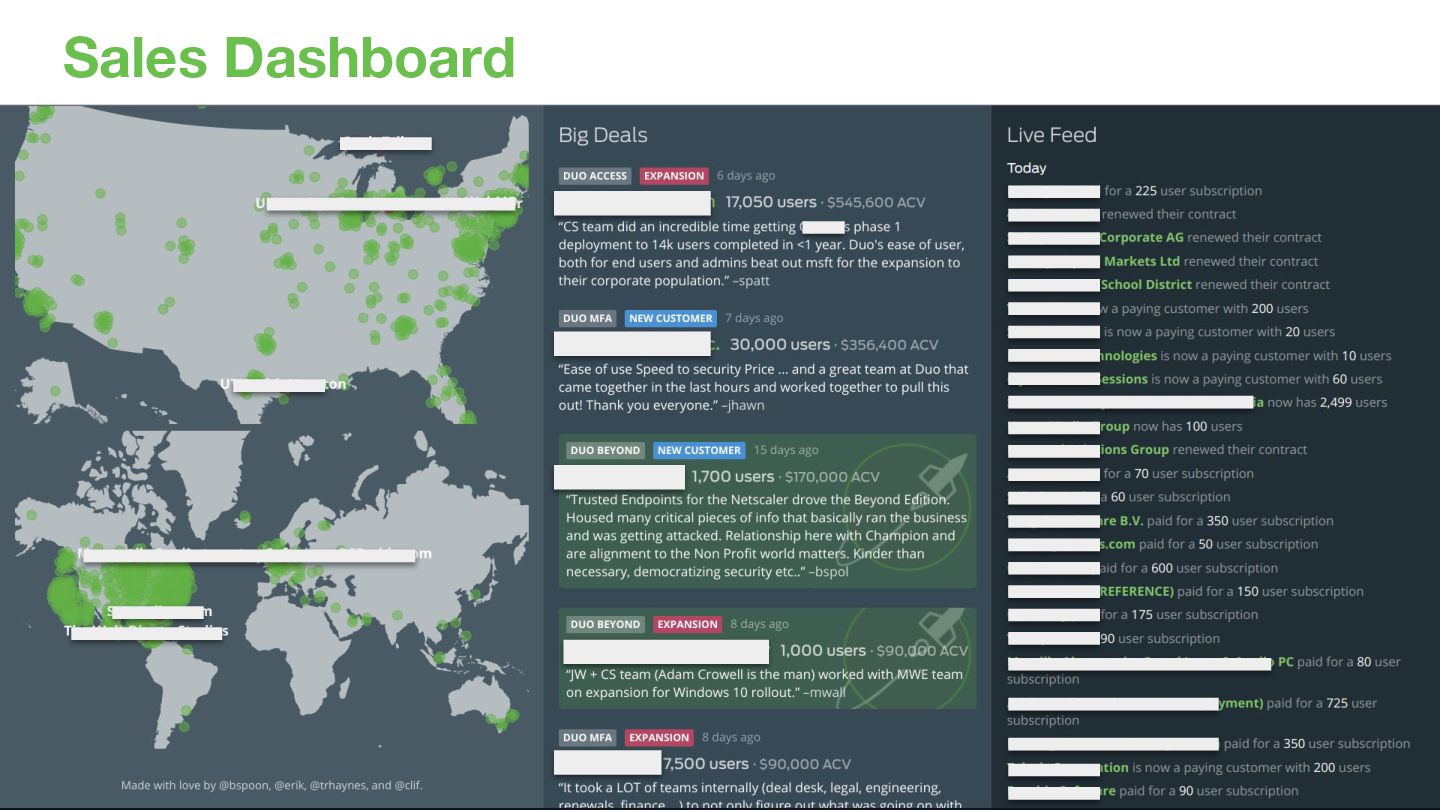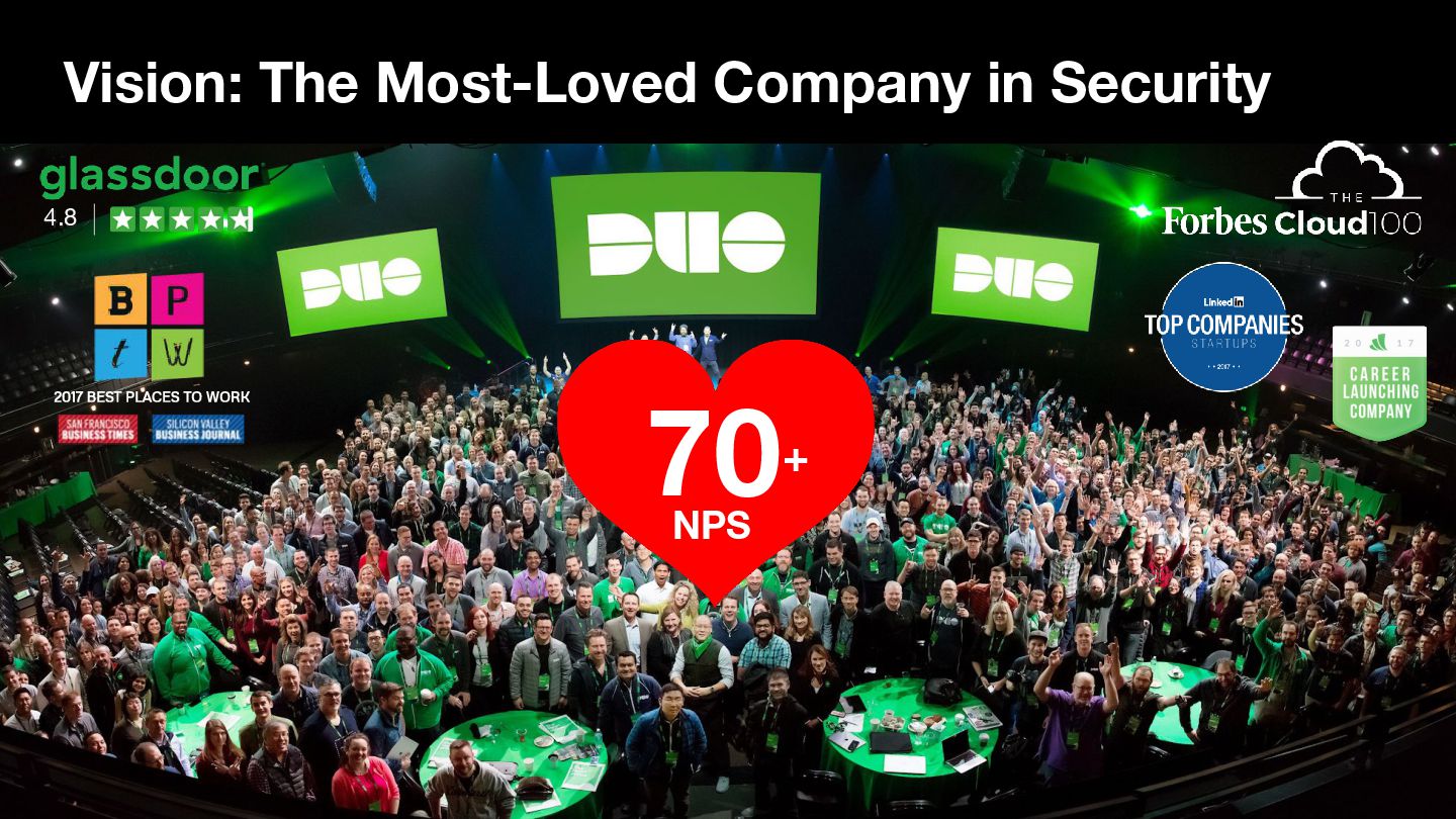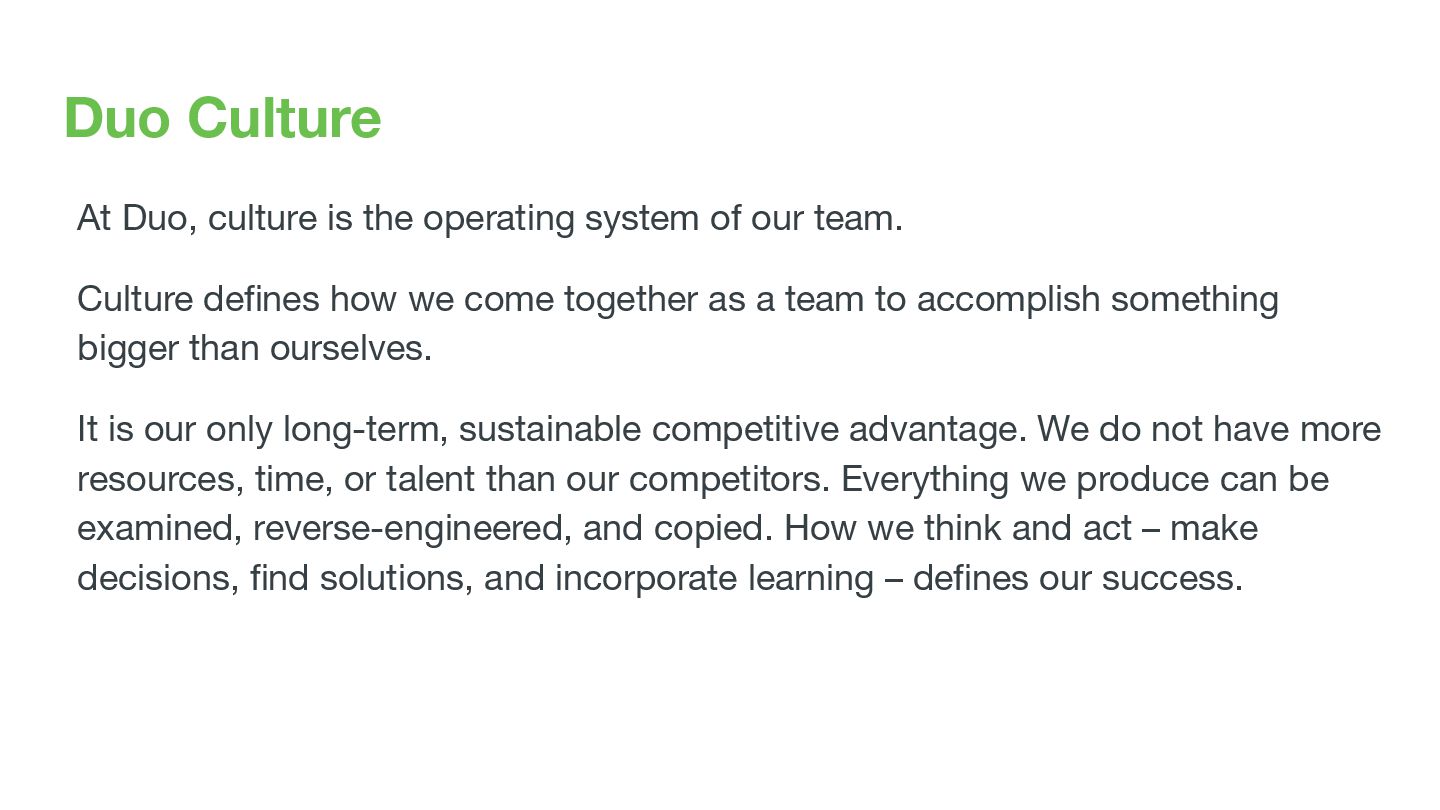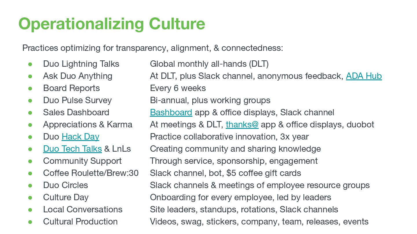 Duo Lightning Talks Global monthly all-hands (DLT) • Ask Duo Anything At DLT, plus Slack channel, anonymous feedback, ADA Hub • Board Reports Every 6 weeks • Duo Pulse Survey Bi-annual, plus working groups • Sales Dashboard Bashboard app & office displays, Slack channel • Appreciations & Karma At meetings & DLT, thanks@ app & office displays, duobot • Duo Hack Day Practice collaborative innovation, 3x year • Duo Tech Talks & LnLs Creating community and sharing knowledge • Community Support Through service, sponsorship, engagement • Coffee Roulette/Brew:30 Slack channel, bot, $5 coffee gift cards • Duo Circles Slack channels & meetings of employee resource groups • Culture Day Onboarding for every employee, led by leaders • Local Conversations Site leaders, standups, rotations, Slack channels • Cultural Production Videos, swag, stickers, company, team, releases, events