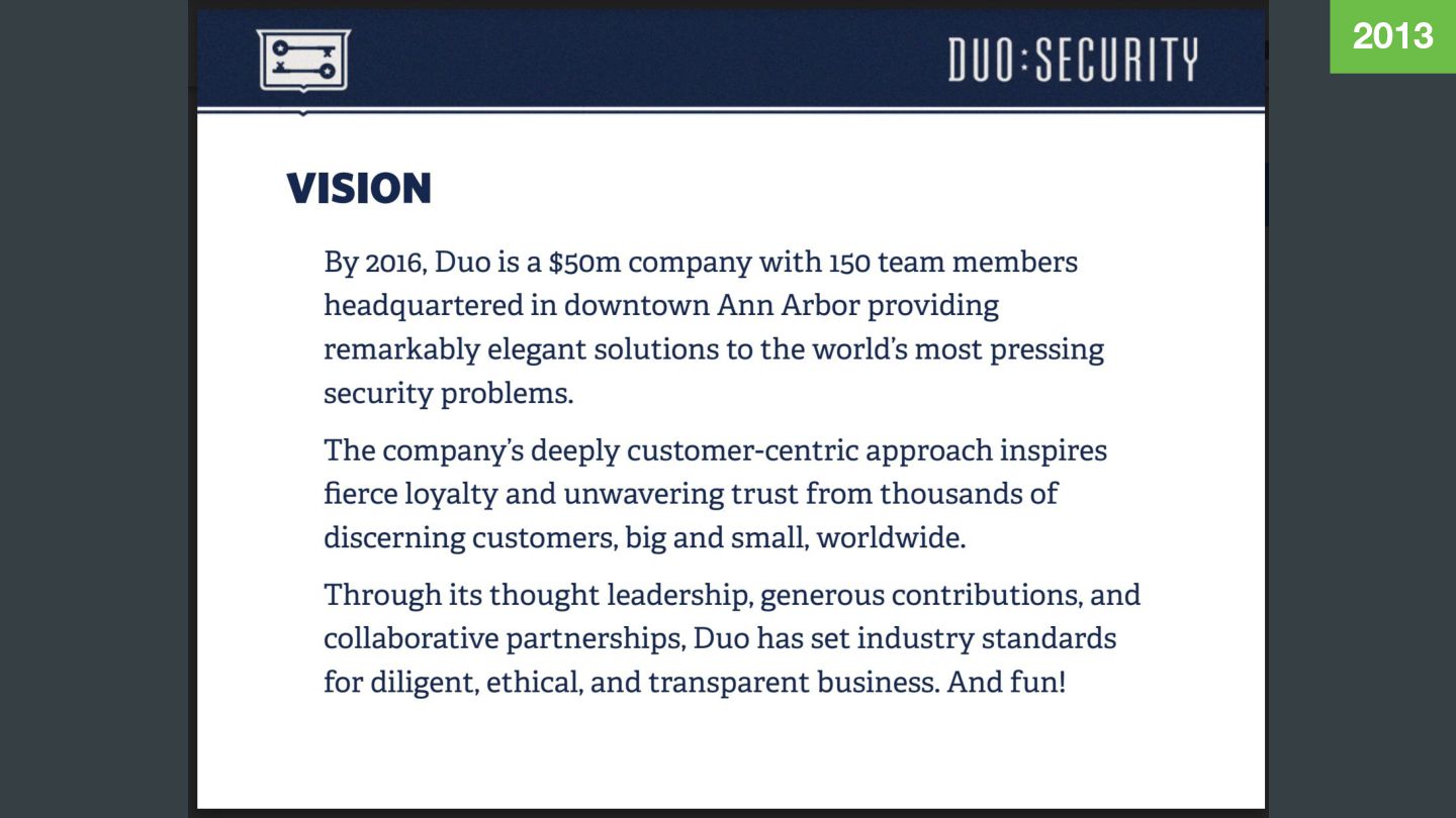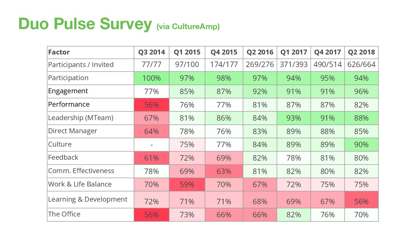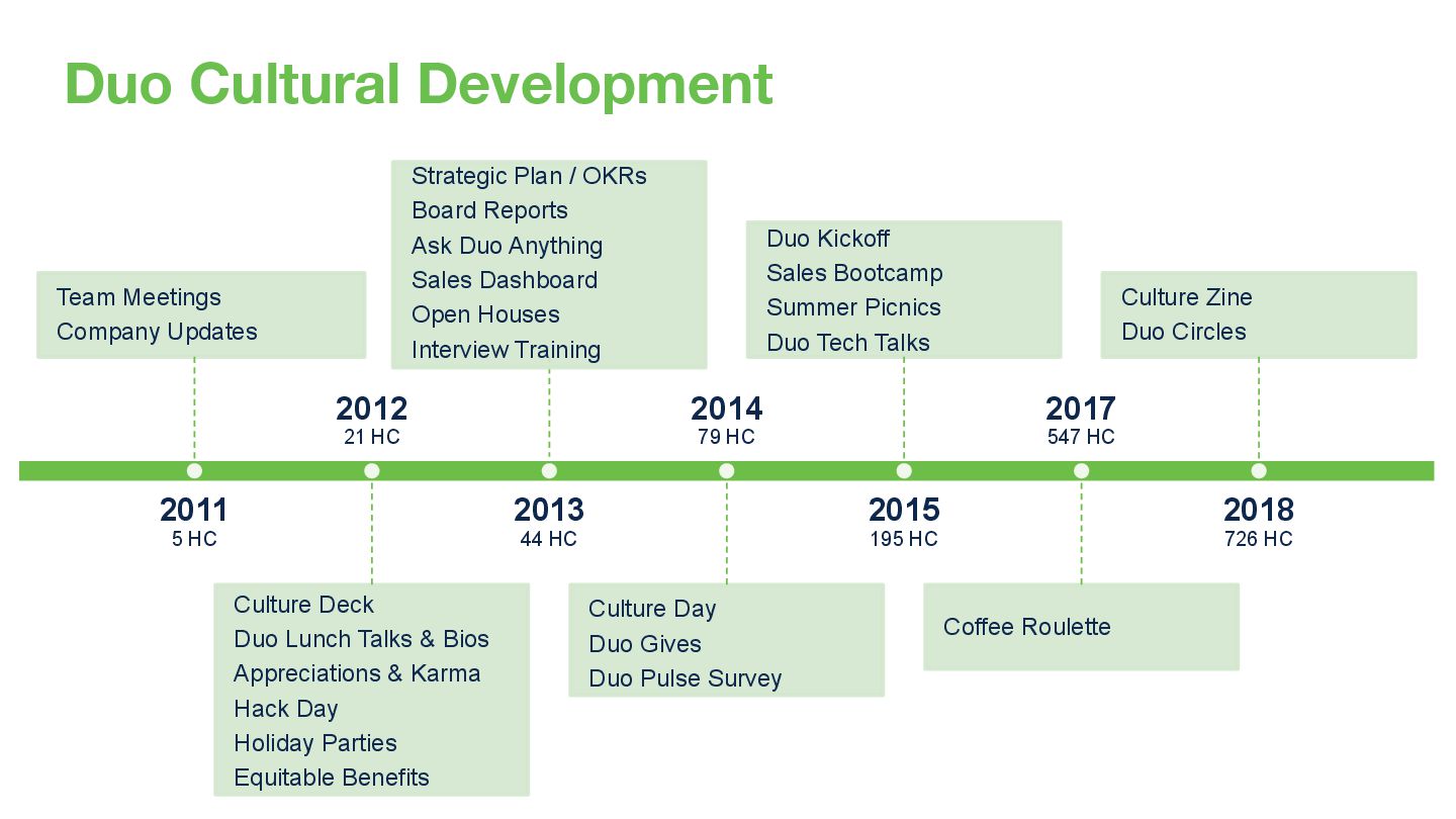 2012 21 HC Culture Deck Duo Lunch Talks & Bios Appreciations & Karma Hack Day Holiday Parties Equitable Benefits 2013 44 HC Strategic Plan / OKRs Board Reports Ask Duo Anything Sales Dashboard Open Houses Interview Training 2014 79 HC Culture Day Duo Gives Duo Pulse Survey 2015 195 HC Duo Kickoff Sales Bootcamp Summer Picnics Duo Tech Talks 2017 547 HC Coffee Roulette 2018 726 HC Culture Zine Duo Circles