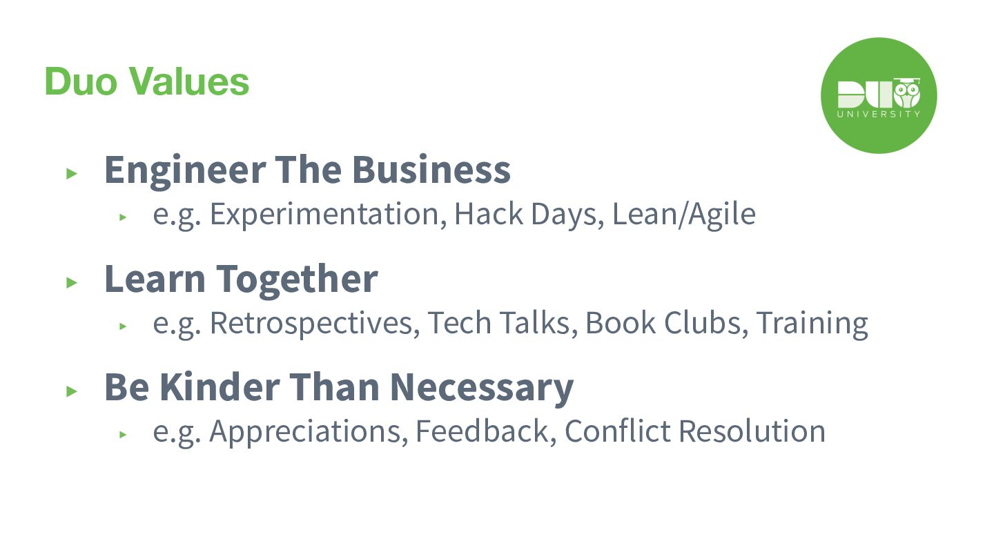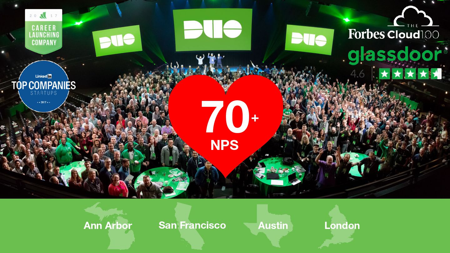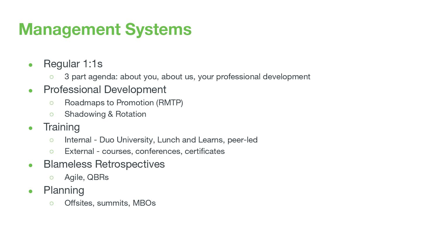 you, about us, your professional development • Professional Development ◦ Roadmaps to Promotion (RMTP) ◦ Shadowing & Rotation • Training ◦ Internal - Duo University, Lunch and Learns, peer-led ◦ External - courses, conferences, certificates • Blameless Retrospectives ◦ Agile, QBRs • Planning ◦ Offsites, summits, MBOs