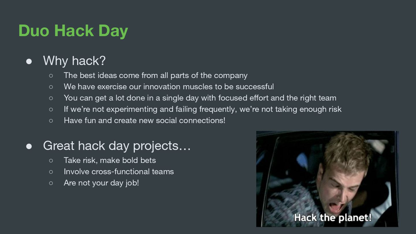 come from all parts of the company ◦ We have exercise our innovation muscles to be successful ◦ You can get a lot done in a single day with focused effort and the right team ◦ If we’re not experimenting and failing frequently, we’re not taking enough risk ◦ Have fun and create new social connections! • Great hack day projects… ◦ Take risk, make bold bets ◦ Involve cross-functional teams ◦ Are not your day job!