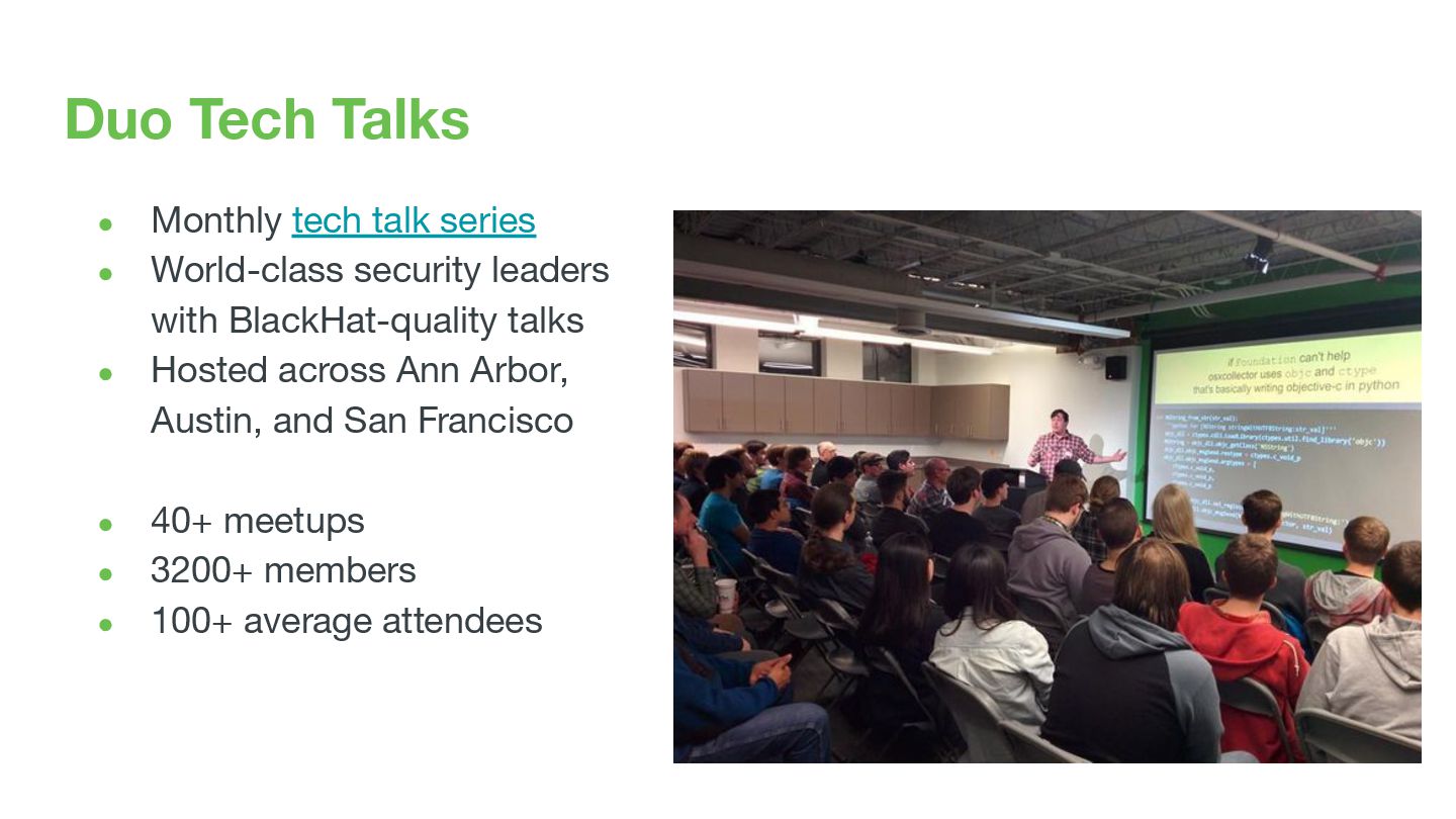 security leaders with BlackHat-quality talks • Hosted across Ann Arbor, Austin, and San Francisco • 40+ meetups • 3200+ members • 100+ average attendees