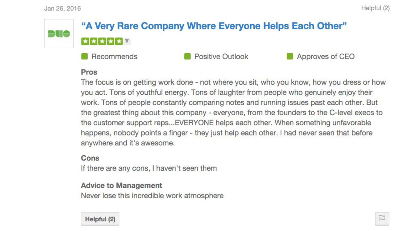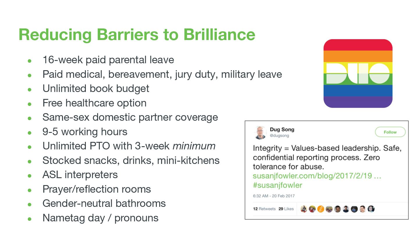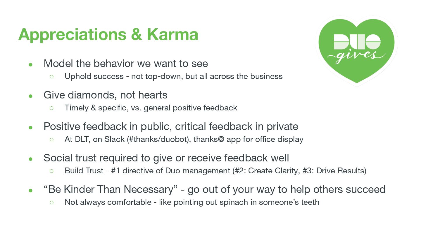see ◦ Uphold success - not top-down, but all across the business • Give diamonds, not hearts ◦ Timely & specific, vs. general positive feedback • Positive feedback in public, critical feedback in private ◦ At DLT, on Slack (#thanks/duobot), thanks@ app for office display • Social trust required to give or receive feedback well ◦ Build Trust - #1 directive of Duo management (#2: Create Clarity, #3: Drive Results) • “Be Kinder Than Necessary” - go out of your way to help others succeed ◦ Not always comfortable - like pointing out spinach in someone’s teeth