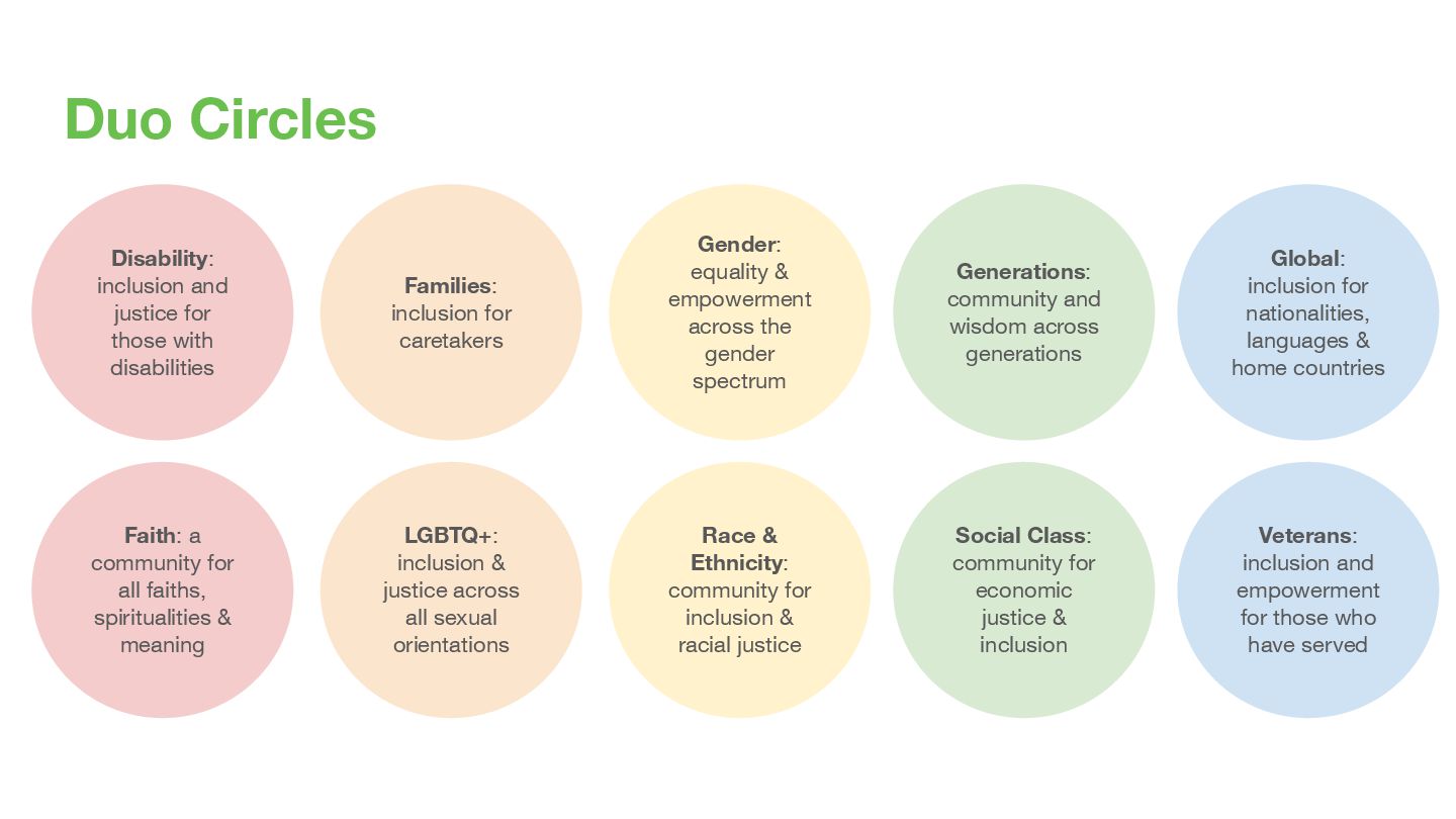 Race & Ethnicity: community for inclusion & racial justice Gender: equality & empowerment across the gender spectrum Faith: a community for all faiths, spiritualities & meaning Families: inclusion for caretakers Social Class: community for economic justice & inclusion Veterans: inclusion and empowerment for those who have served Global: inclusion for nationalities, languages & home countries LGBTQ+: inclusion & justice across all sexual orientations Generations: community and wisdom across generations