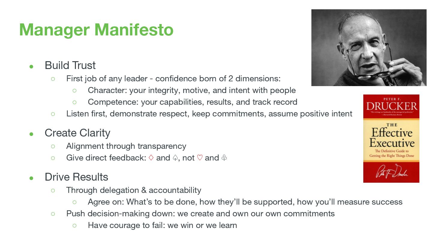 leader - confidence born of 2 dimensions: ◦ Character: your integrity, motive, and intent with people ◦ Competence: your capabilities, results, and track record ◦ Listen first, demonstrate respect, keep commitments, assume positive intent • Create Clarity ◦ Alignment through transparency ◦ Give direct feedback: ♢ and ♤, not ♡ and ♧ • Drive Results ◦ Through delegation & accountability ◦ Agree on: What’s to be done, how they’ll be supported, how you’ll measure success ◦ Push decision-making down: we create and own our own commitments ◦ Have courage to fail: we win or we learn