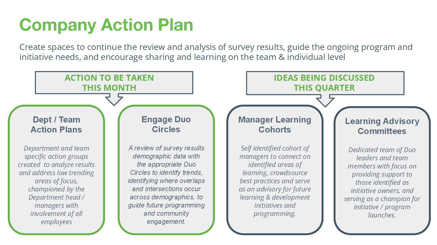 leaders and team members with focus on providing support to those identified as initiative owners, and serving as a champion for initiative / program launches. Create spaces to continue the review and analysis of survey results, guide the ongoing program and initiative needs, and encourage sharing and learning on the team & individual level Engage Duo Circles A review of survey results demographic data with the appropriate Duo Circles to identify trends, identifying where overlaps and intersections occur across demographics, to guide future programming and community engagement. Manager Learning Cohorts Self identified cohort of managers to connect on identified areas of learning, crowdsource best practices and serve as an advisory for future learning & development initiatives and programming. Dept / Team Action Plans Department and team specific action groups created to analyze results and address low trending areas of focus, championed by the Department head / managers with involvement of all employees ACTION TO BE TAKEN THIS MONTH IDEAS BEING DISCUSSED THIS QUARTER
