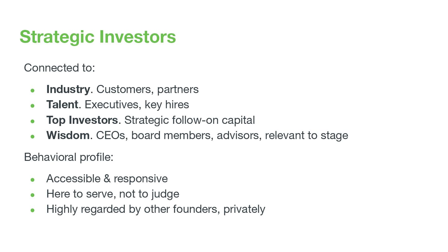 Executives, key hires • Top Investors. Strategic follow-on capital • Wisdom. CEOs, board members, advisors, relevant to stage Behavioral profile: • Accessible & responsive • Here to serve, not to judge • Highly regarded by other founders, privately