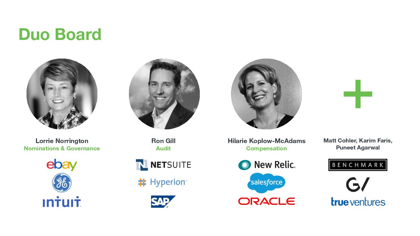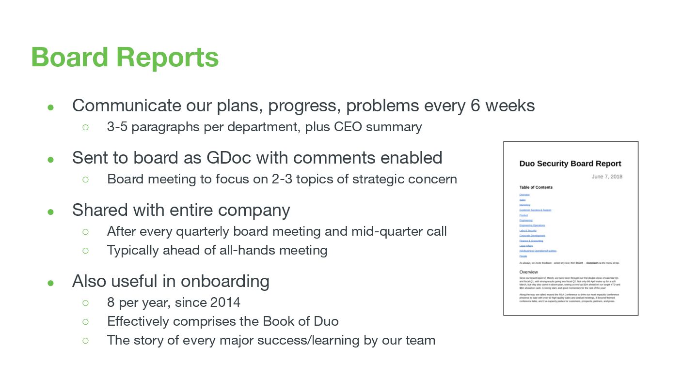 weeks ◦ 3-5 paragraphs per department, plus CEO summary • Sent to board as GDoc with comments enabled ◦ Board meeting to focus on 2-3 topics of strategic concern • Shared with entire company ◦ After every quarterly board meeting and mid-quarter call ◦ Typically ahead of all-hands meeting • Also useful in onboarding ◦ 8 per year, since 2014 ◦ Effectively comprises the Book of Duo ◦ The story of every major success/learning by our team