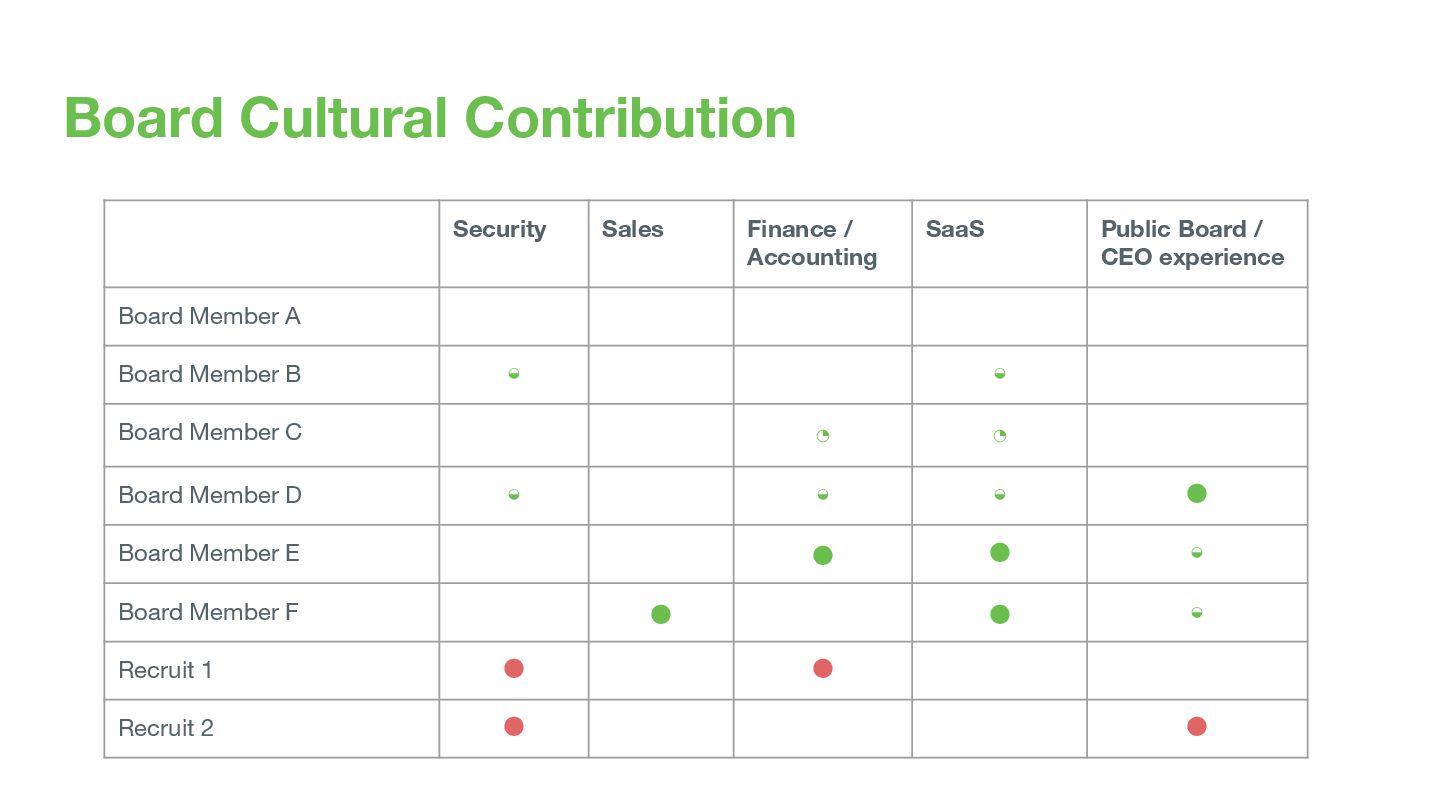 Board / CEO experience Board Member A Board Member B ◒ ◒ Board Member C ◔ ◔ Board Member D ◒ ◒ ◒ ⬤ Board Member E ⬤ ⬤ ◒ Board Member F ⬤ ⬤ ◒ Recruit 1 ⬤ ⬤ Recruit 2 ⬤ ⬤