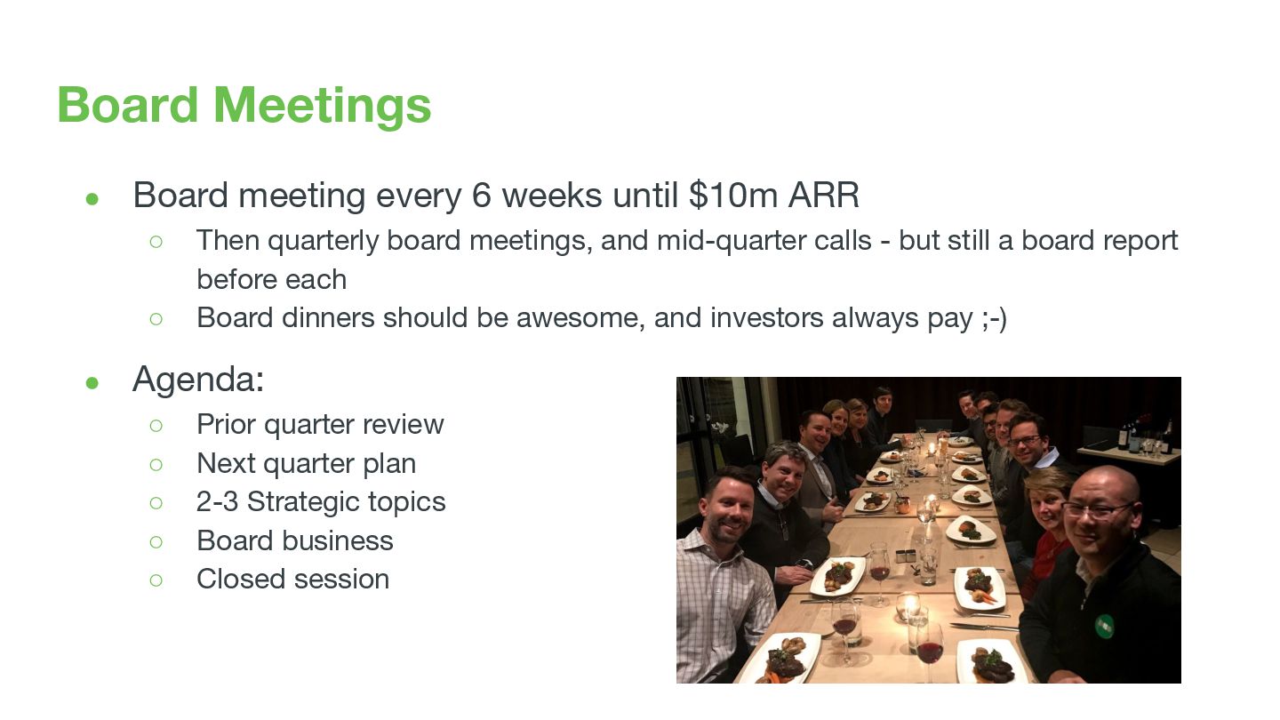 ARR ◦ Then quarterly board meetings, and mid-quarter calls - but still a board report before each ◦ Board dinners should be awesome, and investors always pay ;-) • Agenda: ◦ Prior quarter review ◦ Next quarter plan ◦ 2-3 Strategic topics ◦ Board business ◦ Closed session