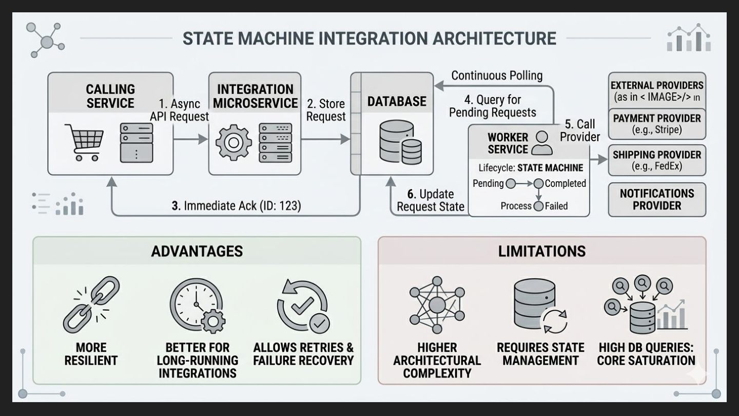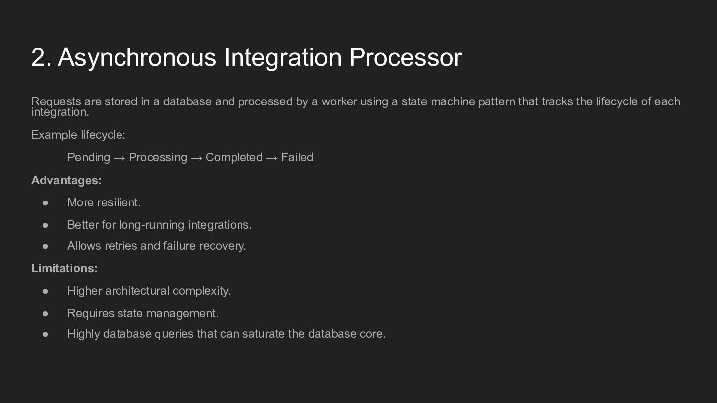 and processed by a worker using a state machine pattern that tracks the lifecycle of each integration. Example lifecycle: Pending → Processing → Completed → Failed Advantages: • More resilient. • Better for long-running integrations. • Allows retries and failure recovery. Limitations: • Higher architectural complexity. • Requires state management. • Highly database queries that can saturate the database core.