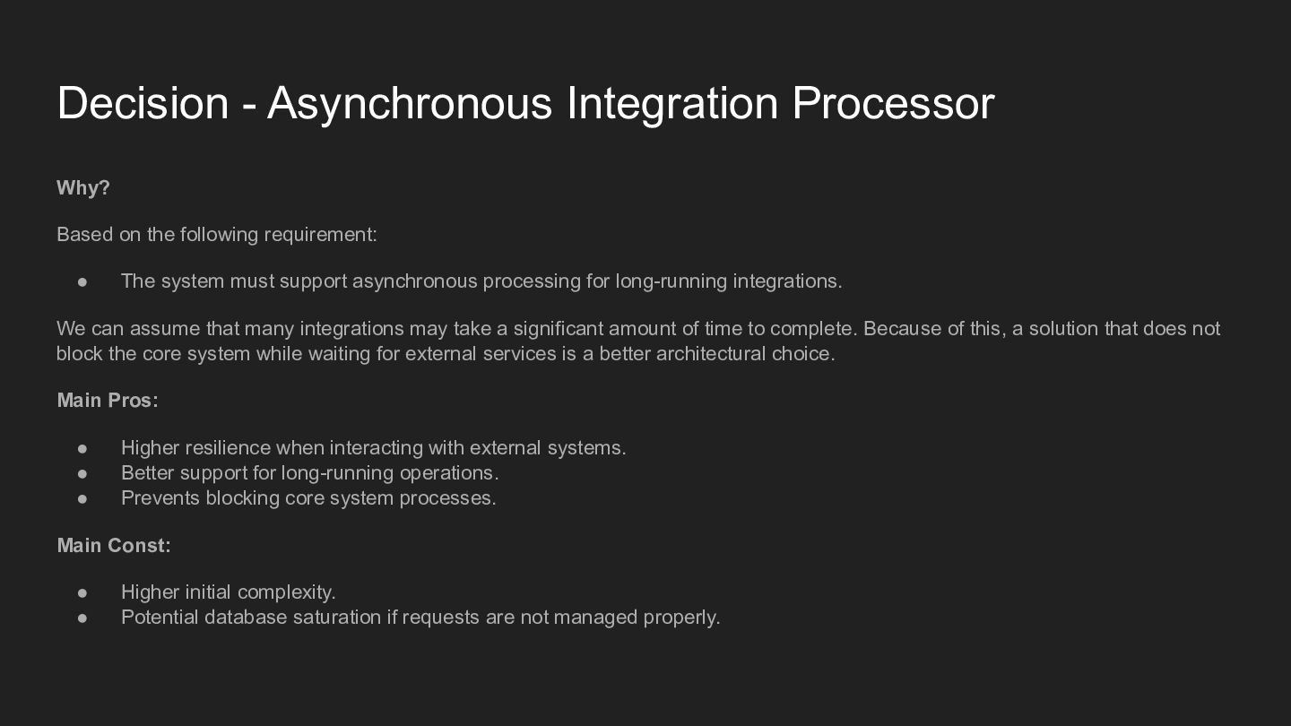 requirement: • The system must support asynchronous processing for long-running integrations. We can assume that many integrations may take a significant amount of time to complete. Because of this, a solution that does not block the core system while waiting for external services is a better architectural choice. Main Pros: • Higher resilience when interacting with external systems. • Better support for long-running operations. • Prevents blocking core system processes. Main Const: • Higher initial complexity. • Potential database saturation if requests are not managed properly.