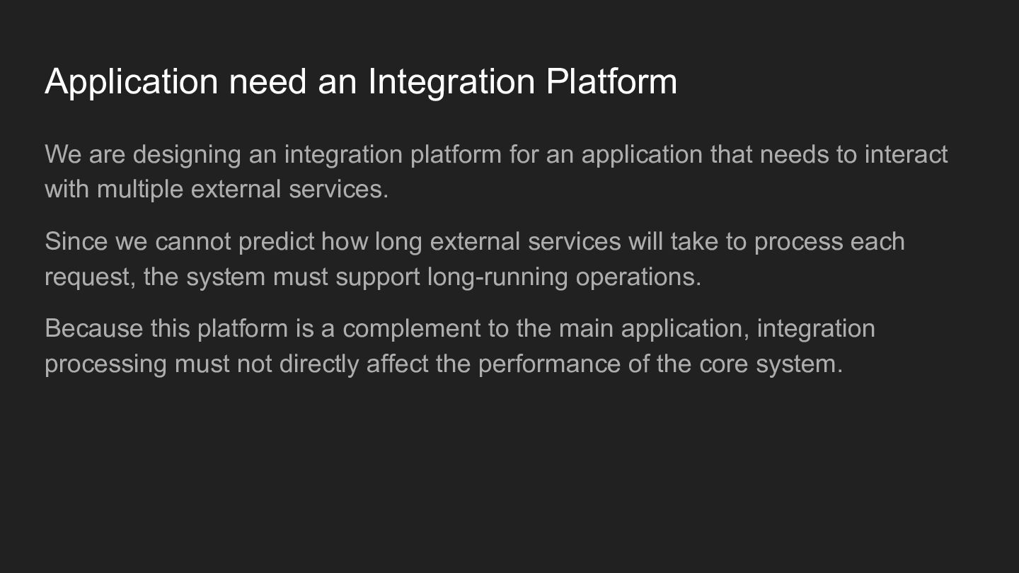 platform for an application that needs to interact with multiple external services. Since we cannot predict how long external services will take to process each request, the system must support long-running operations. Because this platform is a complement to the main application, integration processing must not directly affect the performance of the core system.