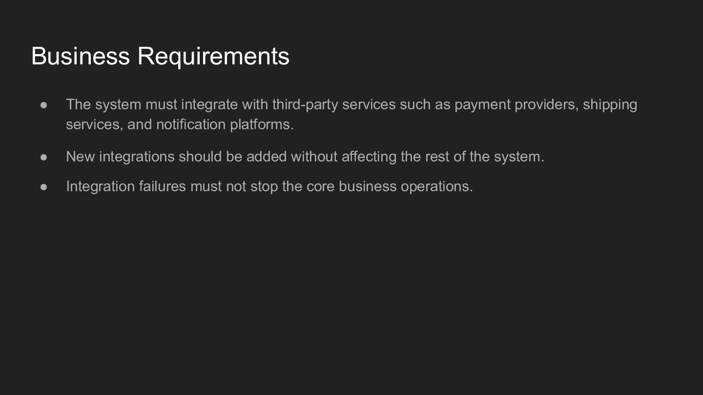 such as payment providers, shipping services, and notification platforms. • New integrations should be added without affecting the rest of the system. • Integration failures must not stop the core business operations.