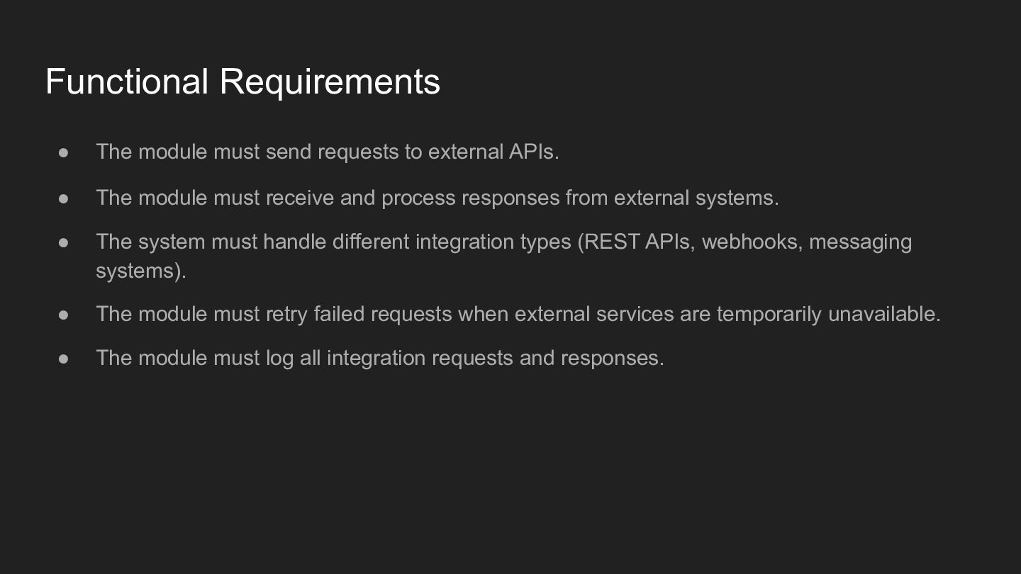 APIs. • The module must receive and process responses from external systems. • The system must handle different integration types (REST APIs, webhooks, messaging systems). • The module must retry failed requests when external services are temporarily unavailable. • The module must log all integration requests and responses.