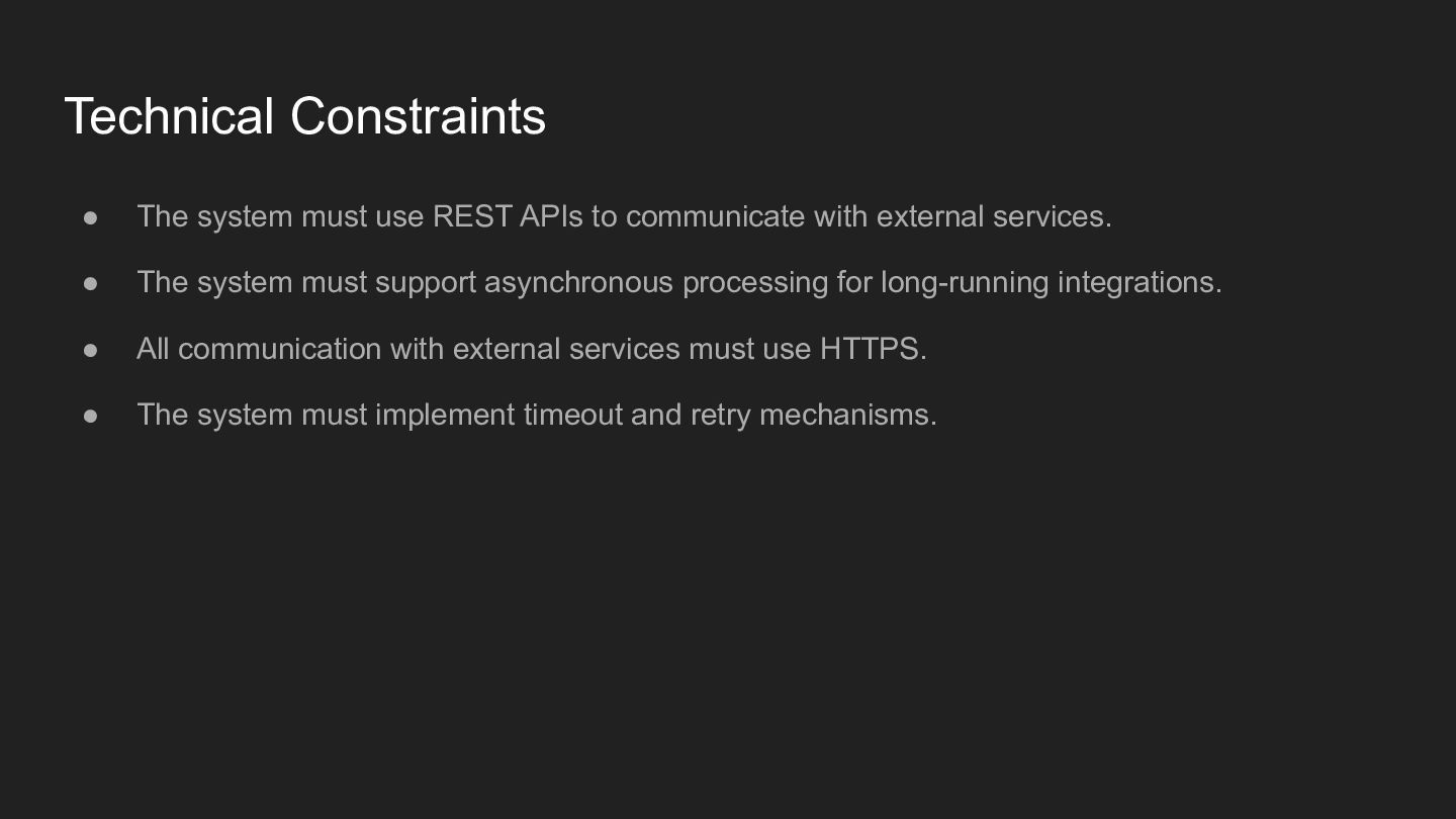 communicate with external services. • The system must support asynchronous processing for long-running integrations. • All communication with external services must use HTTPS. • The system must implement timeout and retry mechanisms.