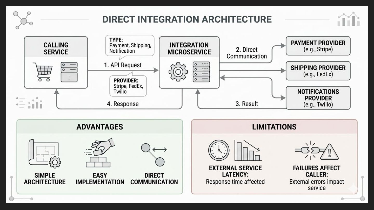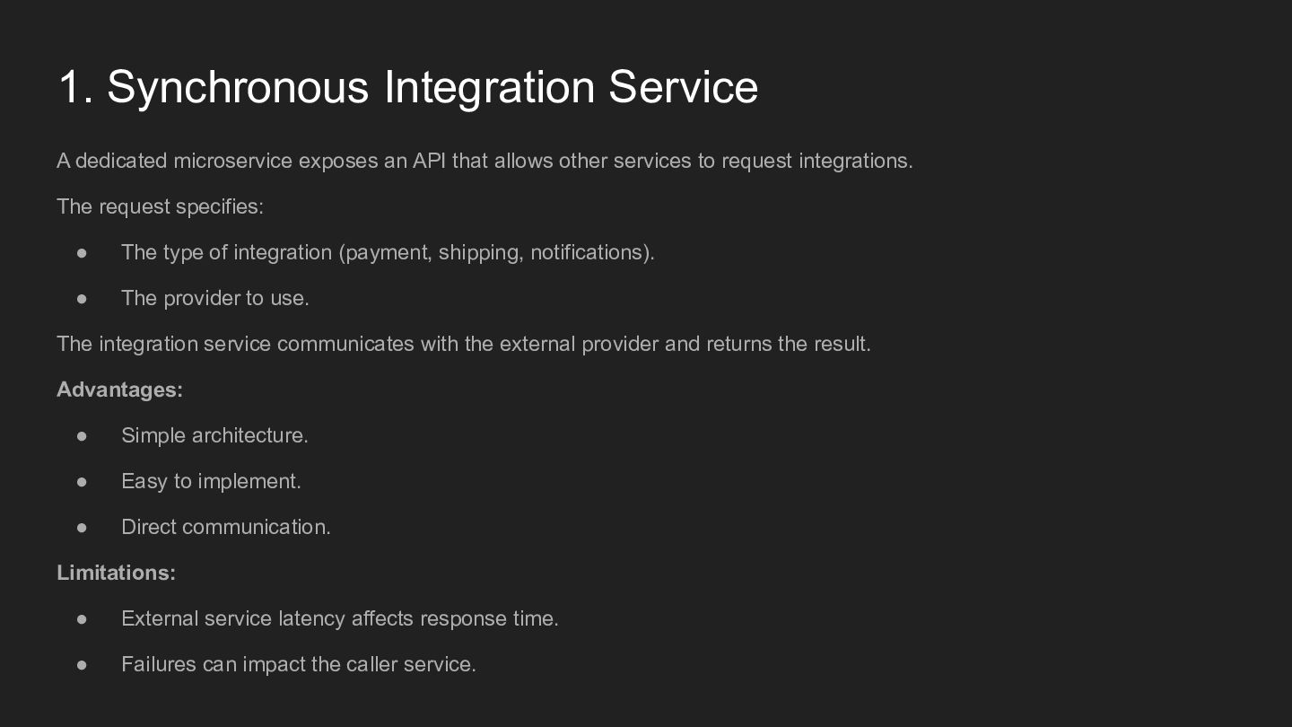 that allows other services to request integrations. The request specifies: • The type of integration (payment, shipping, notifications). • The provider to use. The integration service communicates with the external provider and returns the result. Advantages: • Simple architecture. • Easy to implement. • Direct communication. Limitations: • External service latency affects response time. • Failures can impact the caller service.