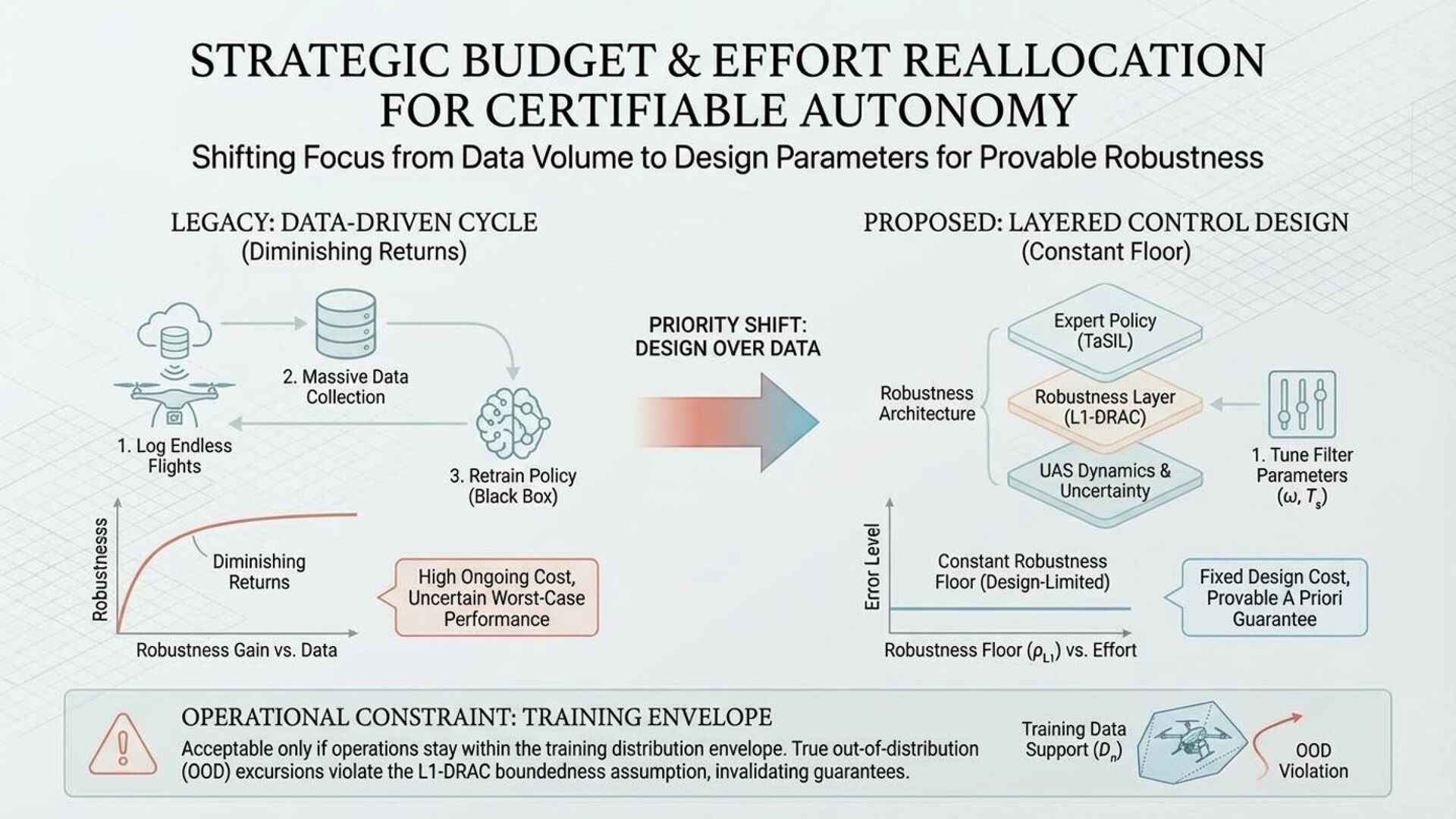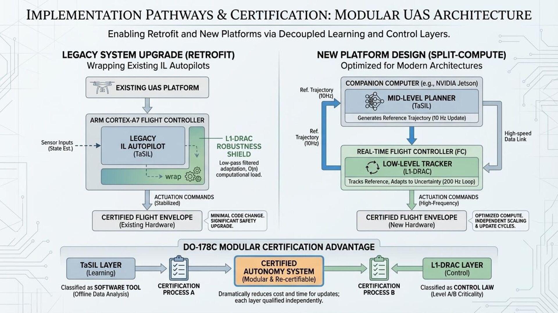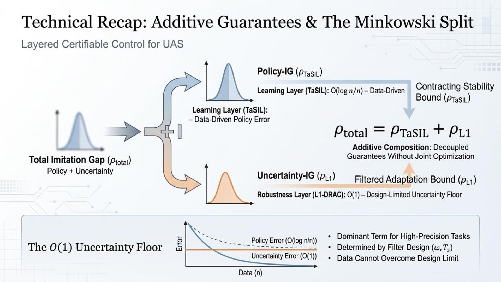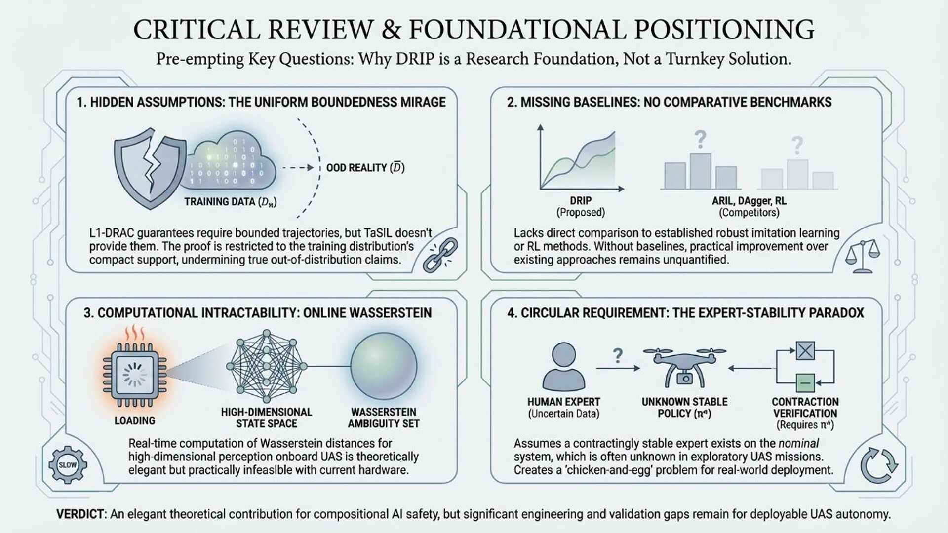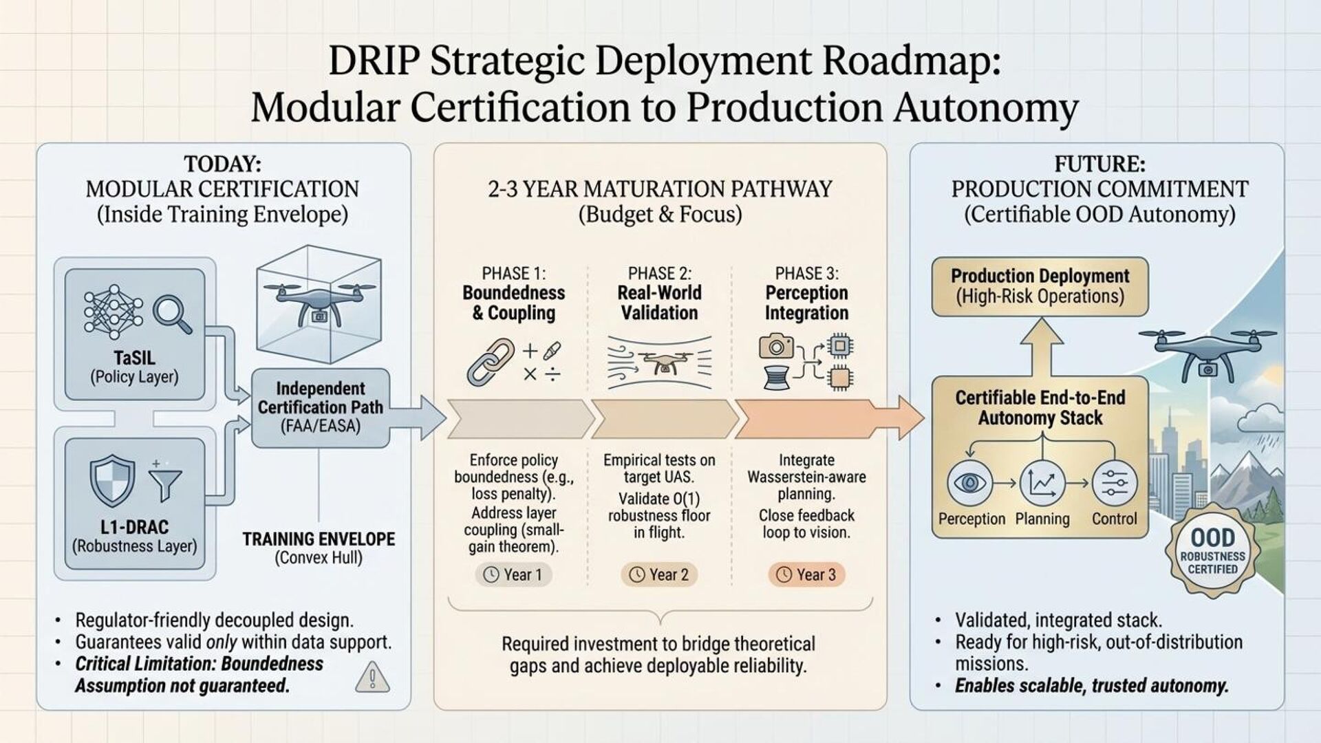A foundational theoretical contribution that reframes AI safety as compositional engineering. The gap between mathematical guarantee and deployable UAS autonomy remains significant. Claims of OOD robustness are aspirational. Ideal for research programs and regulatory strategy; premature for production systems without addressing boundedness and coupling limitation.