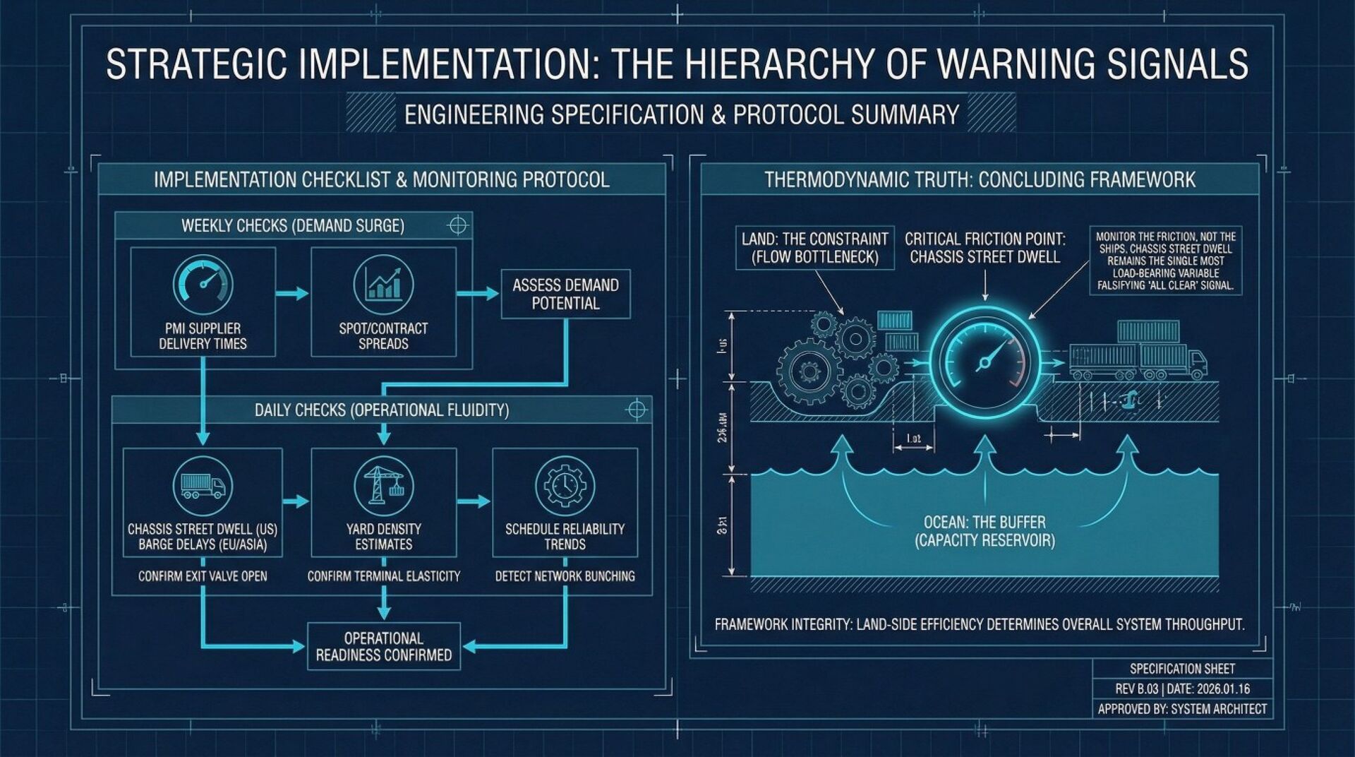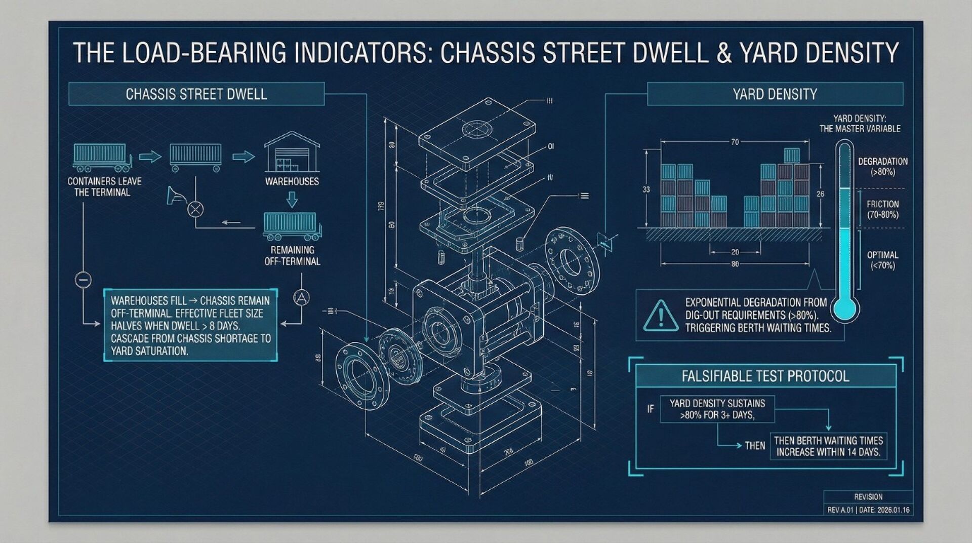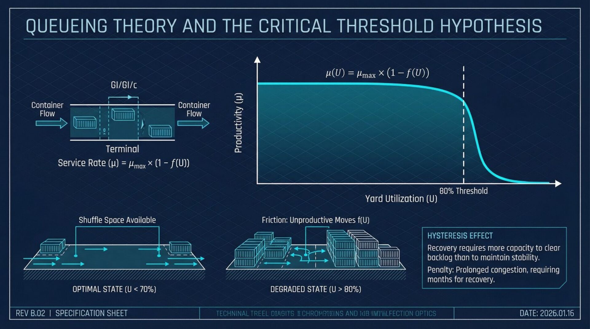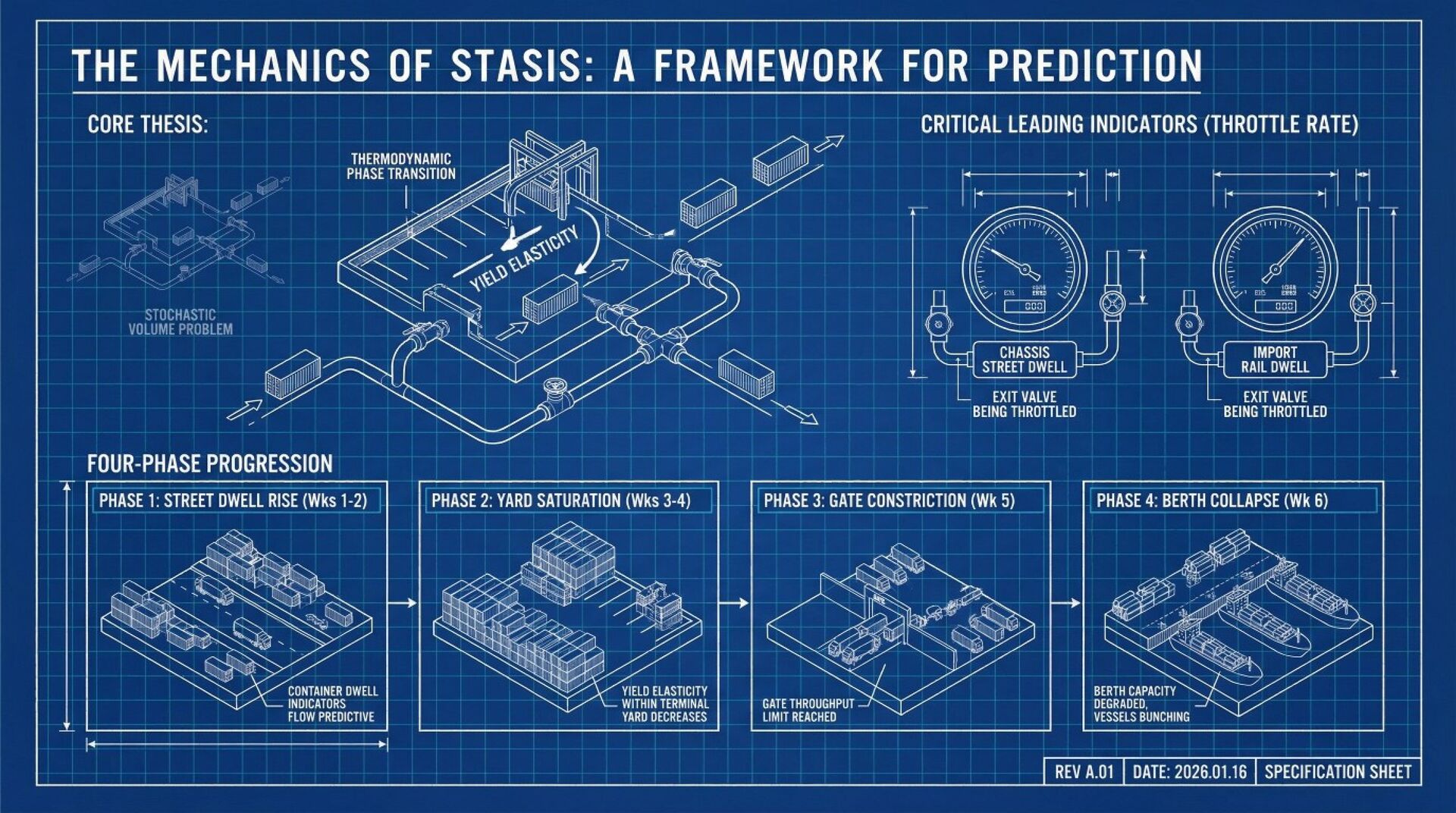 Port congestion is not a stochastic volume problem but a thermodynamic phase transition driven by yield elasticity within the terminal yard. The central thesis establishes that when yard density crosses 80-85% threshold, terminal processing ability drops exponentially. This framework rejects lagging indicators (anchorage counts, berth waiting times) in favor of load-bearing precursors: yard density thresholds, chassis street dwell times, intermodal rail decoupling, and spot rate divergences. The progression follows four predictable phases: Precursor (street dwell rises), Saturation (yard density breaches 80%), Constriction (gate fluidity drops), and Collapse (berth occupancy hits 100%).