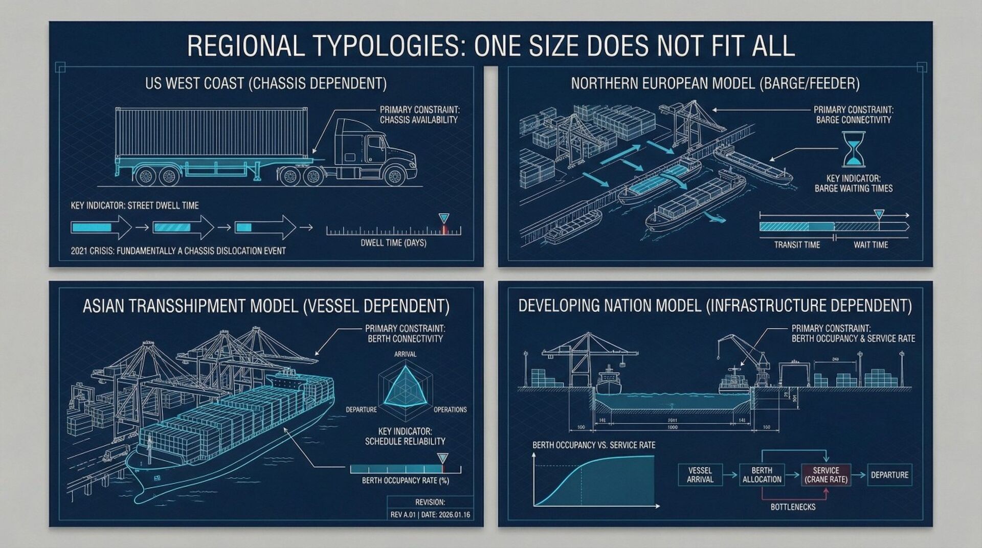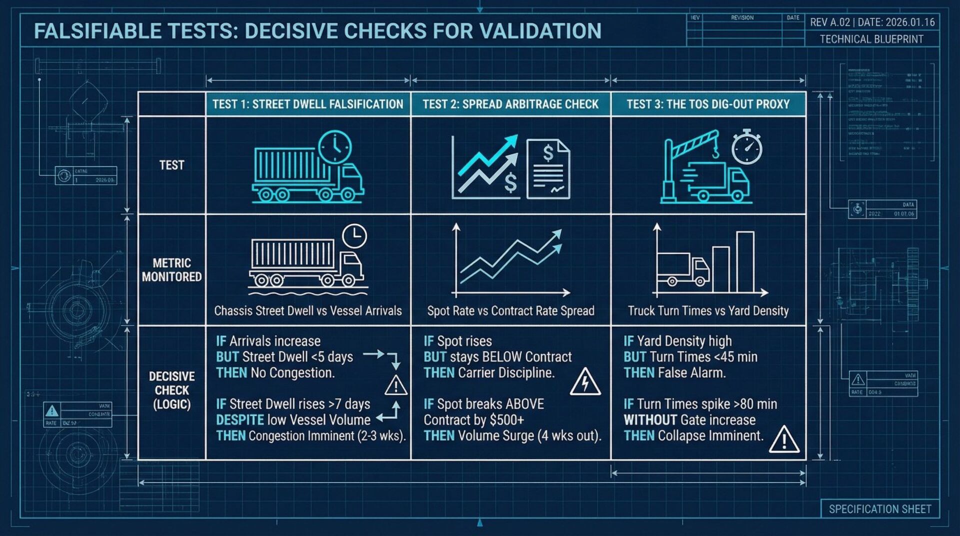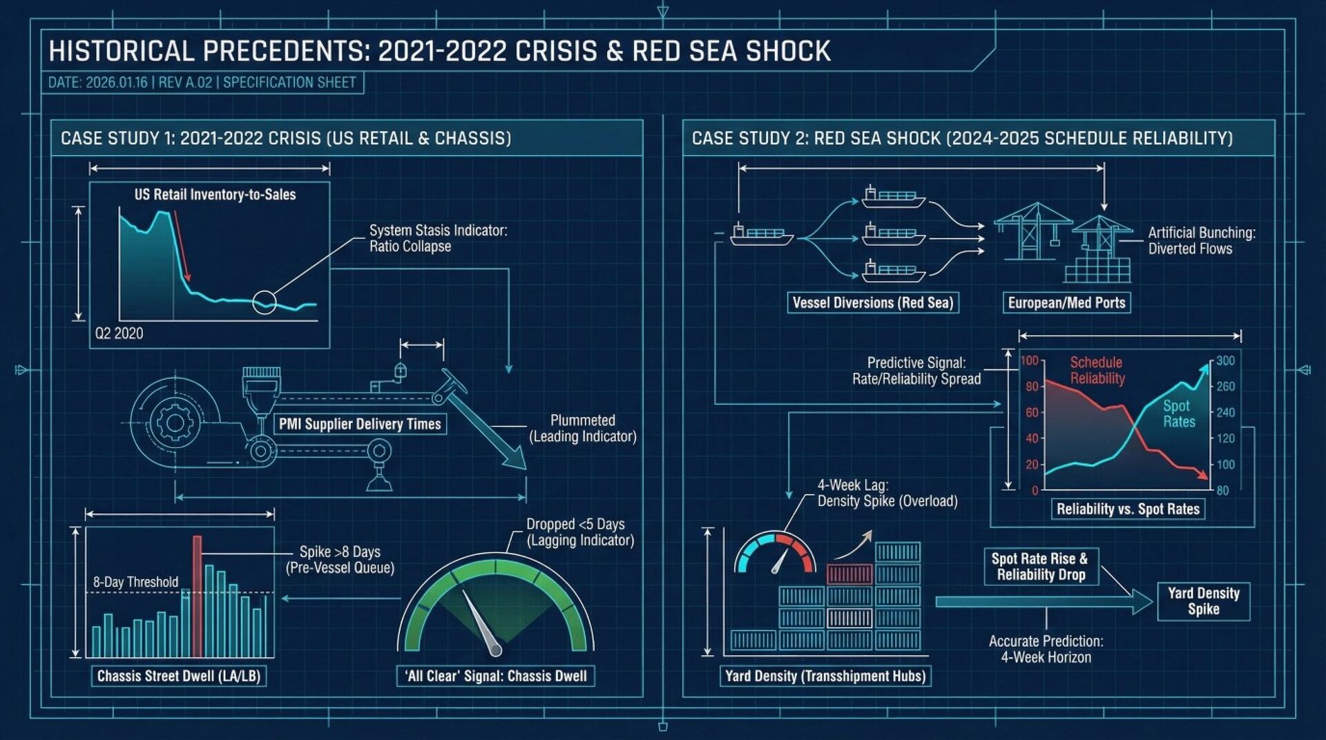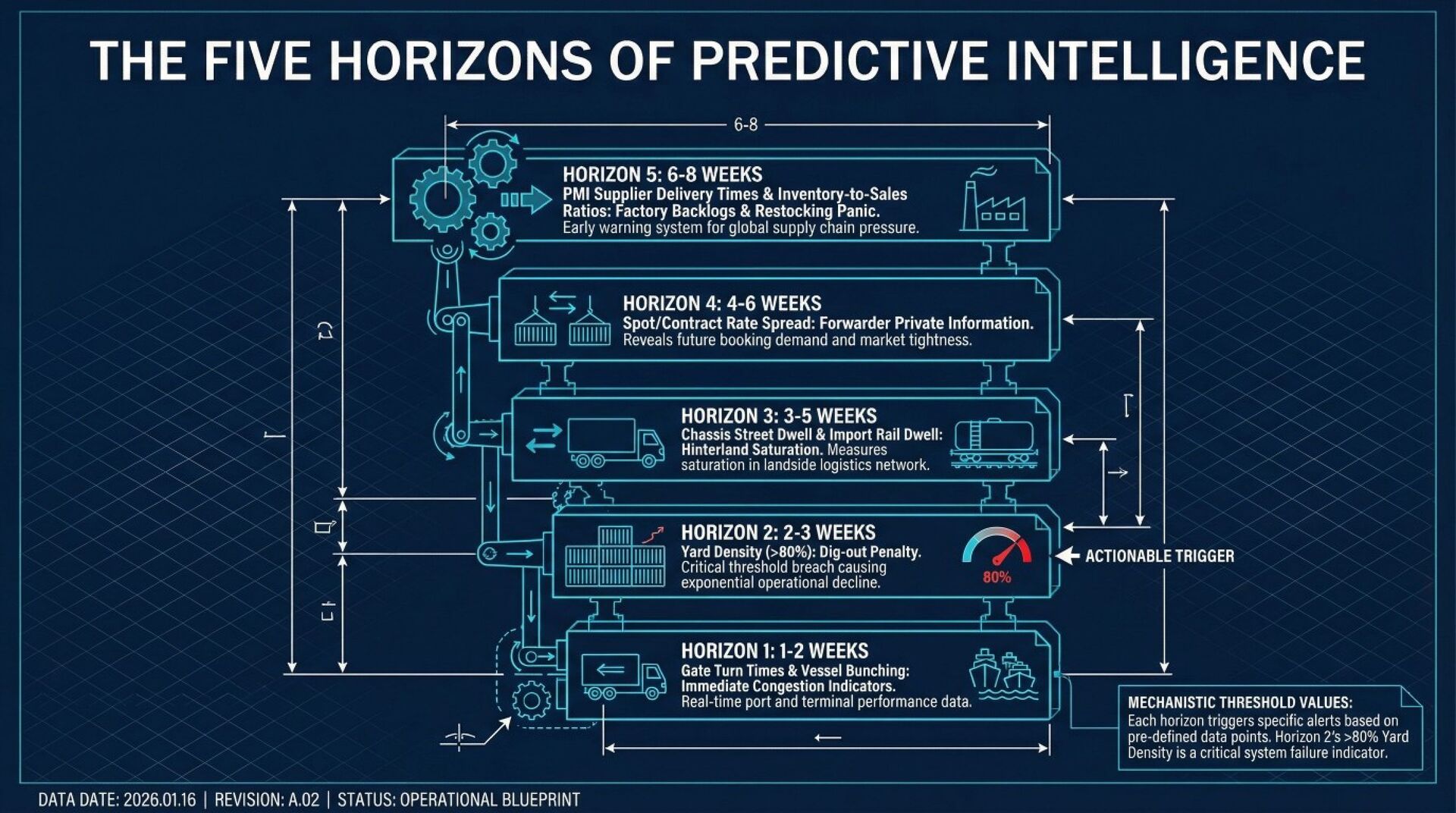 Port congestion is not a stochastic volume problem but a thermodynamic phase transition driven by yield elasticity within the terminal yard. The central thesis establishes that when yard density crosses 80-85% threshold, terminal processing ability drops exponentially. This framework rejects lagging indicators (anchorage counts, berth waiting times) in favor of load-bearing precursors: yard density thresholds, chassis street dwell times, intermodal rail decoupling, and spot rate divergences. The progression follows four predictable phases: Precursor (street dwell rises), Saturation (yard density breaches 80%), Constriction (gate fluidity drops), and Collapse (berth occupancy hits 100%).