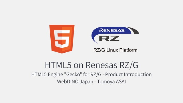 HTML can control font like Adobe applications UI Framework React, Vue, Angular etc... 2D Graphics use Canvas API to render Graph etc with GPU acceleratioon 3D Graphics WebGL ~= OpenGL ES2 Transform, Filter e ects ... zoom, 3d transform with matrix, blur etc also use GPU Binary Operation Binary (Blob) also supported WebAssembly can run almost same speed with Native Database use IndexedDB Network communications HTTP/2, TLS, WebSocket ... Video Camera and Mic (*) use WebRTC Video Codecs webm, vp8,9, h264, ogg theora ... RZ/G support H.264 hardware decode (*) Audio Codecs opus, ac, mp3, wav ... Image les png, jpeg, svg, gif, apng, ... Module UI component and JS libraries are provided as module multi thread use multi core cpus note: p-thread is under dev (*) under development / test 36
