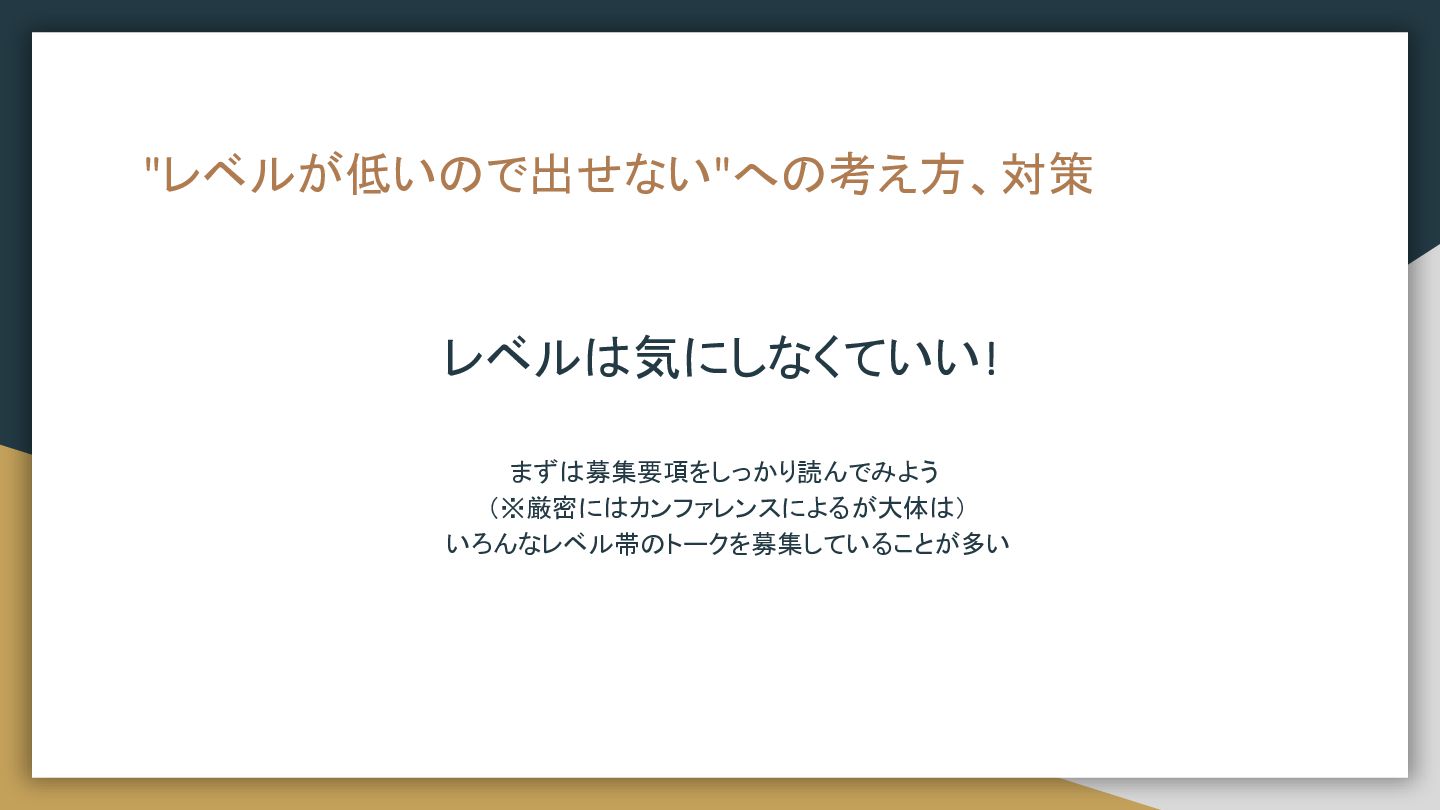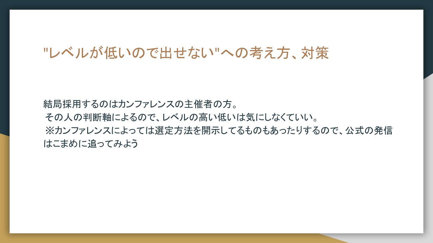 "レベルが低いので出せない"への考え方、対策 結局採用するのはカンファレンスの主催者の方。 その人の判断軸によるので、レベルの高い低いは気にしなくていい。 ※カンファレンスによっては選定方法を開示してるものもあったりするので、公式の発信 はこまめに追ってみよう