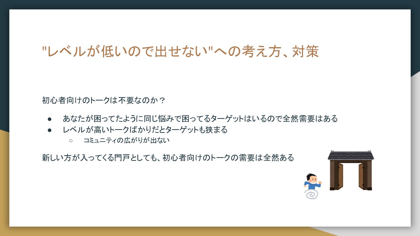 "レベルが低いので出せない"への考え方、対策 初心者向けのトークは不要なのか? • あなたが困ってたように同じ悩みで困ってるターゲットはいるので全然需要はある • レベルが高いトークばかりだとターゲットも狭まる ◦ コミュニティの広がりが出ない 新しい方が入ってくる門戸としても、初心者向けのトークの需要は全然ある