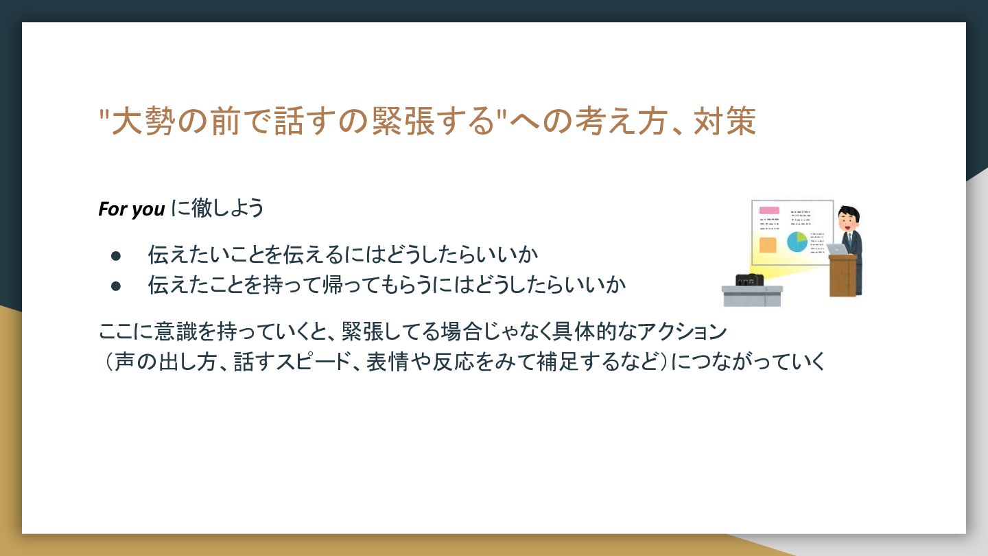 "大勢の前で話すの緊張する"への考え方、対策 For you に徹しよう • 伝えたいことを伝えるにはどうしたらいいか • 伝えたことを持って帰ってもらうにはどうしたらいいか ここに意識を持っていくと、緊張してる場合じゃなく具体的なアクション (声の出し方、話すスピード、表情や反応をみて補足するなど)につながっていく