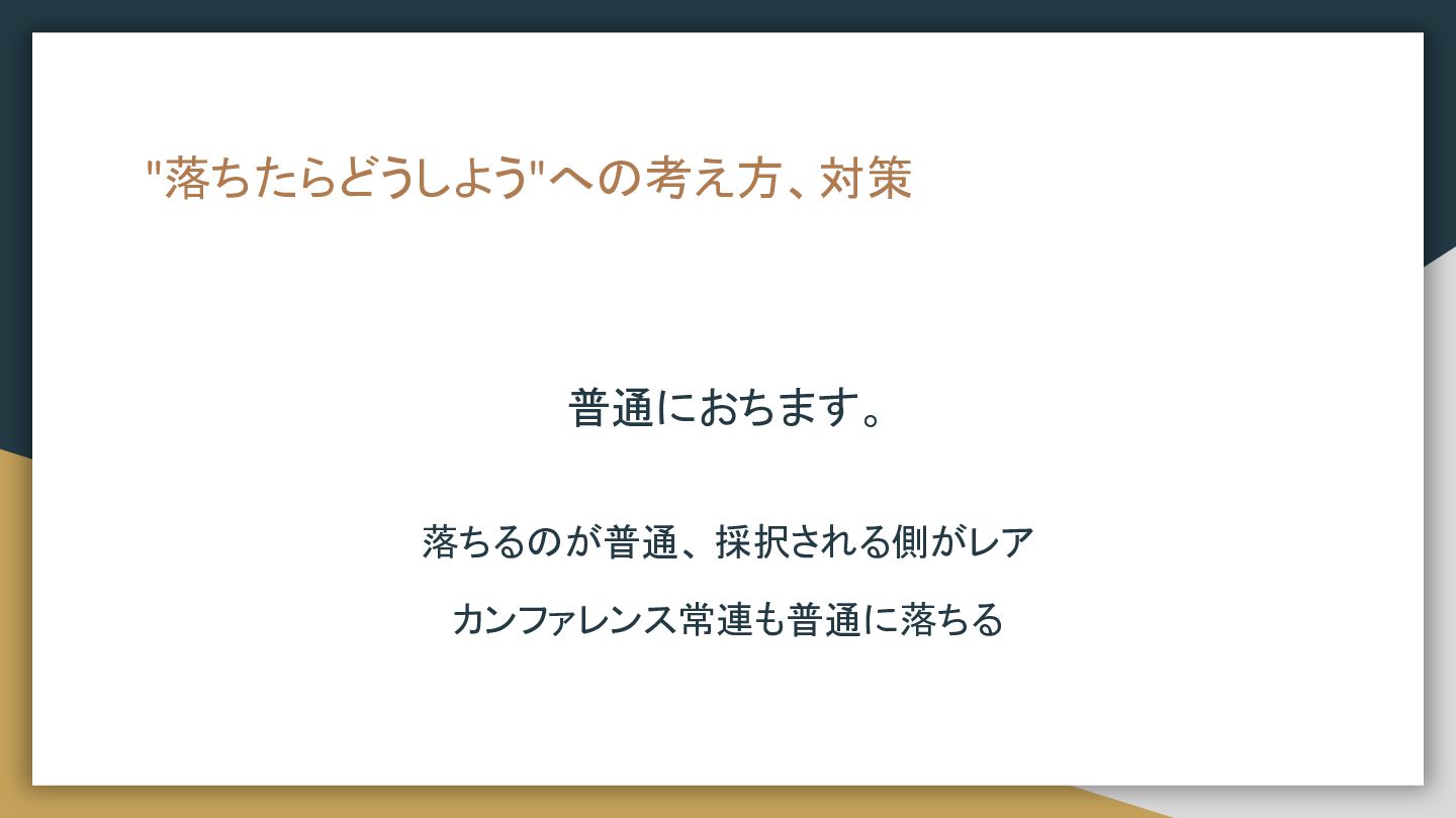 "落ちたらどうしよう"への考え方、対策 普通におちます。 落ちるのが普通、 採択される側がレア カンファレンス常連も普通に落ちる