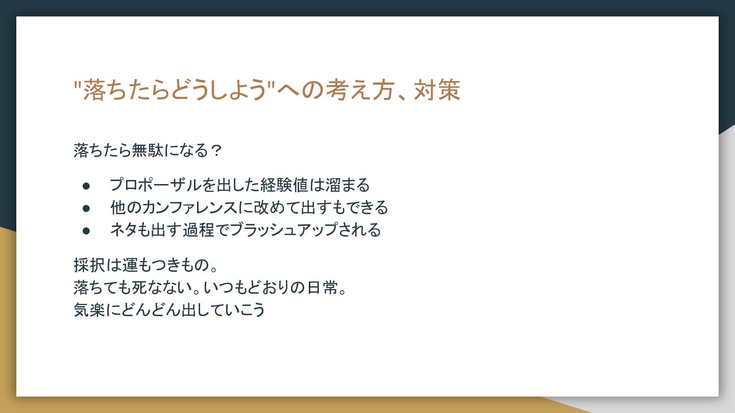 "落ちたらどうしよう"への考え方、対策 落ちたら無駄になる? • プロポーザルを出した経験値は溜まる • 他のカンファレンスに改めて出すもできる • ネタも出す過程でブラッシュアップされる 採択は運もつきもの。 落ちても死なない。いつもどおりの日常。