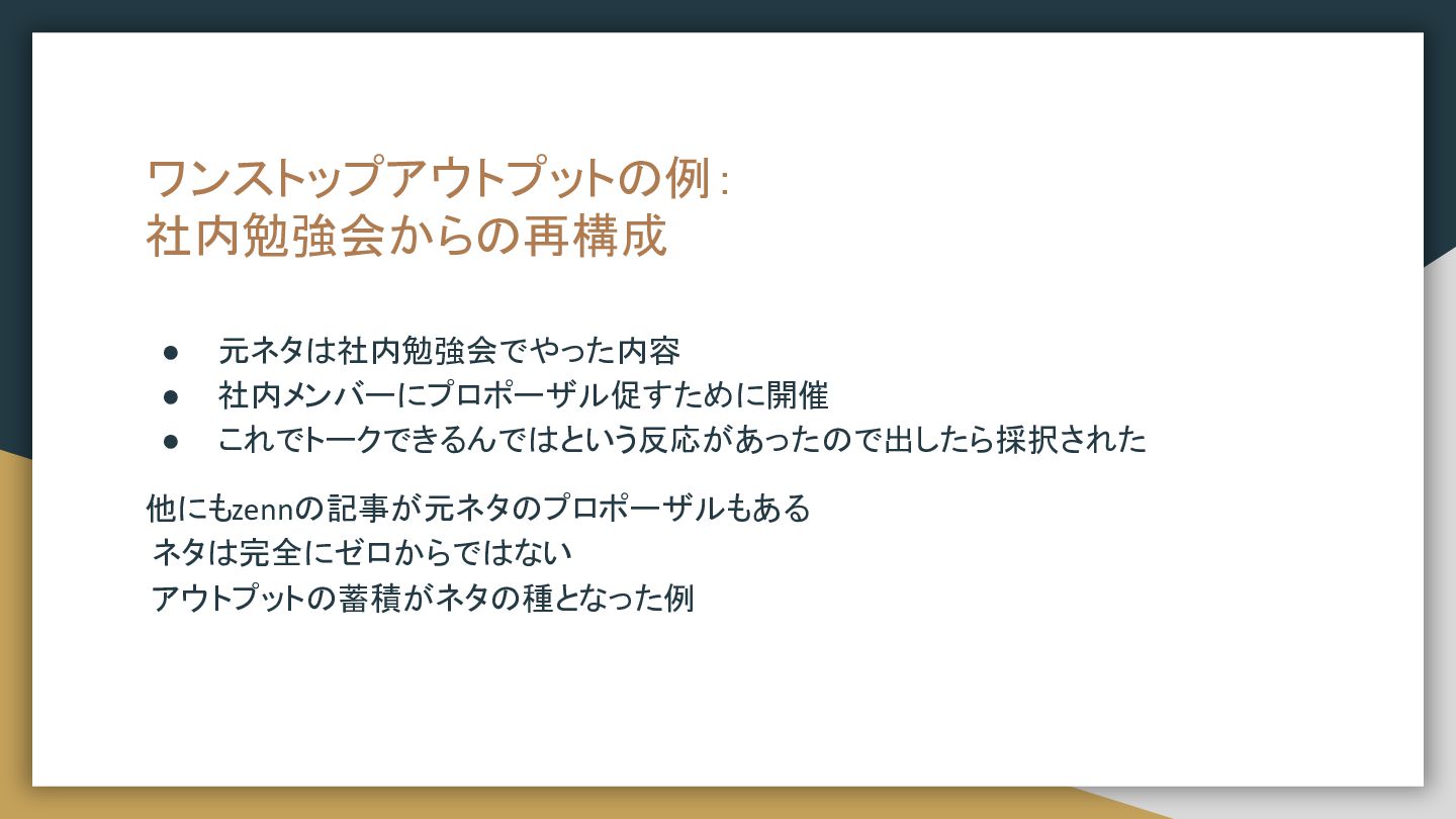 ワンストップアウトプットの例: 社内勉強会からの再構成 • 元ネタは社内勉強会でやった内容 • 社内メンバーにプロポーザル促すために開催 • これでトークできるんではという反応があったので出したら採択された 他にもzennの記事が元ネタのプロポーザルもある ネタは完全にゼロからではない
