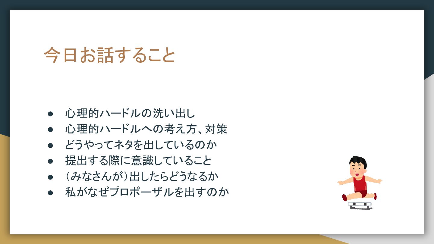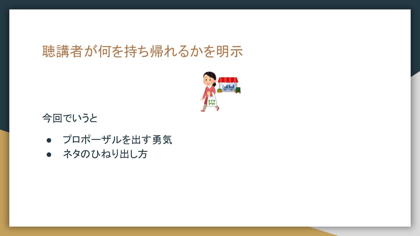 聴講者が何を持ち帰れるかを明示 今回でいうと • プロポーザルを出す勇気 • ネタのひねり出し方